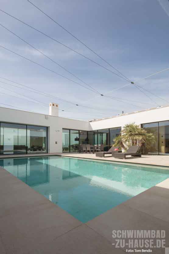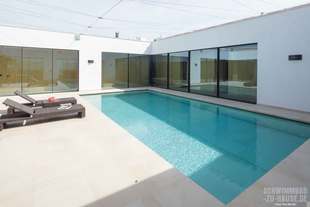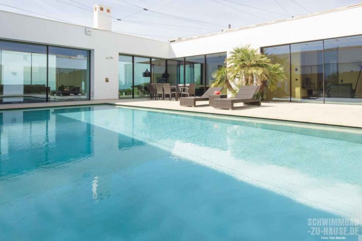 Die meiste Zeit des Jahres verbringen die Bauherren dieses Poolprojekts am Bodensee in Deutschland. „Hier haben wir vor einigen Jahren ein Wohnhaus gebaut. Dabei haben wir mit großzügigen Verglasungen, modernen Formen und neuen Materialien ein sehr harmonisches und lebenswertes Zuhause geschaffen. Diese Offenheit, die Blickbezüge in die freie Natur und vor allem die Materialisierung wollten wir nun auch bei dem Neubau auf Mallorca berücksichtigen“, skizziert das Ehepaar die konkreten Wünsche vor der Planungsphase des privaten Hide-aways. Außer Frage stand hierbei, dass auch ein Pool Teil des Wohnkonzepts werden sollte. Denn bei den tropischen Temperaturen auf der Sonneninsel ist der Sprung ins kühle Nass unverzichtbar. „Wir hatten auch im alten Ferienhaus einen Pool und benutzten ihn neben dem Vergnügen für unsere Enkel auch für das tägliche Fitnessprogramm“, erklärt der Bauherr im Gespräch mit haus und wellness*.
