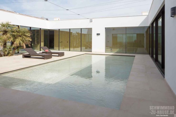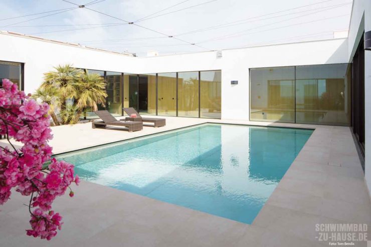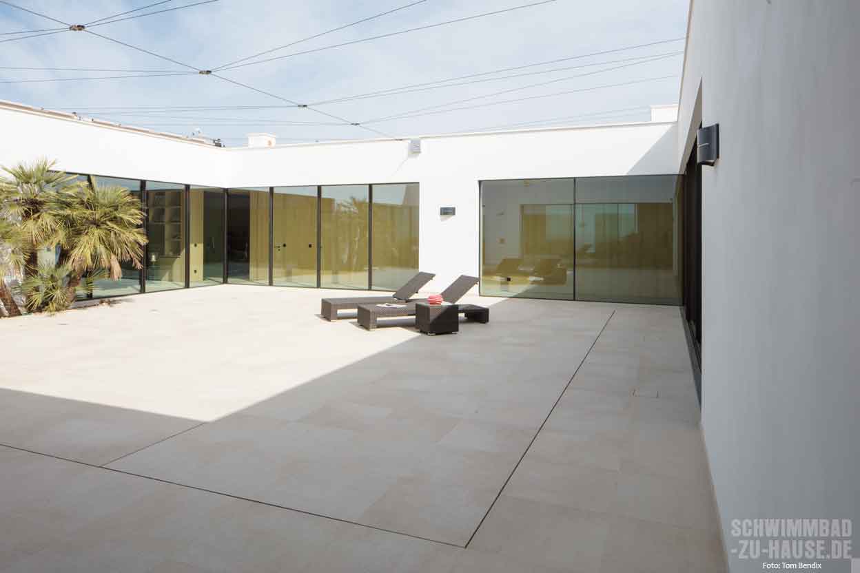 Im Innenhof dieses modernen Neubaus auf Mallorca sollte ein Pool für Erfrischung und Sport sorgen. Da das Platzangebot begrenzt war und die Bauherren nicht auf die Sonnenterrasse verzichten wollten, musste eine technisch raffinierte Lösung her. Dank Hubboden kann der neue Pool jetzt bis auf eine kleine Fuge komplett unsichtbar verschwinden.