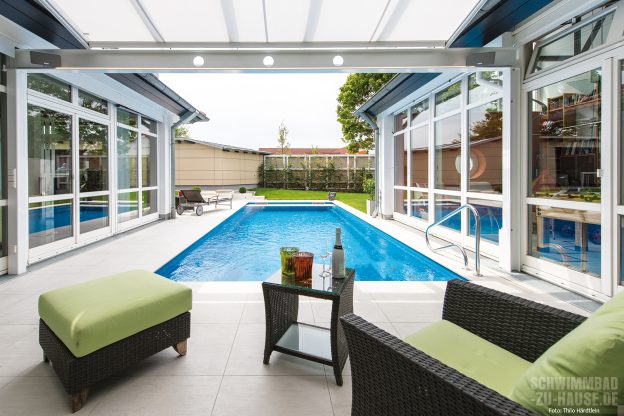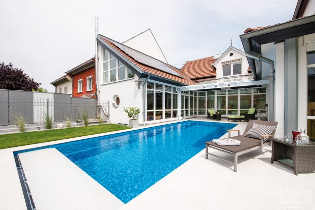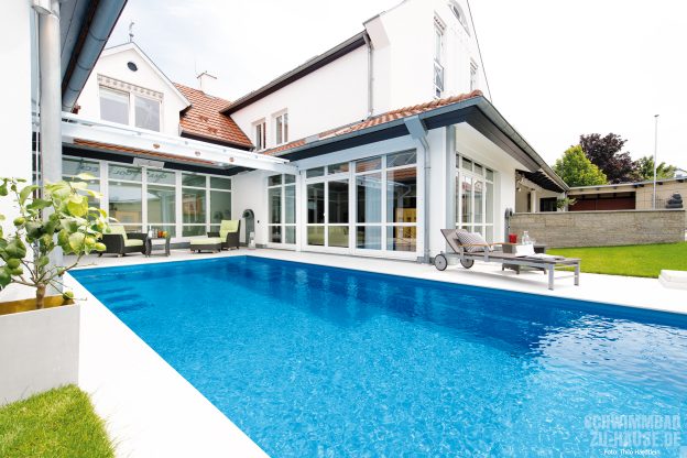 Last but not least bleibt hervorzuheben, dass die speziellen 3-D-Kristalleffektoberflächen zusammen mit dem Beleuchtungskonzept für eine nächtliche Illumination sorgen, die eindrucksvoll den wahrgewordenen Traum von der privaten Wohlfühloase widerspiegelt. Jetzt ist der zehn Meter lange und vier Meter breite Pool am Wochenende ein perfekter Familientreffpunkt für alle drei Generationen.