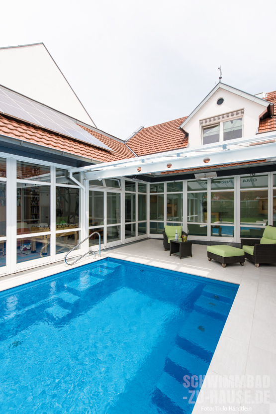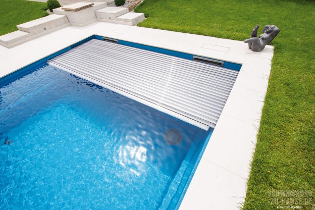 Entsprechend der professionellen Ausrichtung des Gesamtprojekts wurde auch bei der Wahl der technischen Details nicht gespart. Als Becken wurde ein „Compass Ceramic Pool“ mit carbonverstärktem Wandaufbau gewählt. Zudem entschloss man sich, den Beckenboden zusätzlich zu isolieren. Um die Energieeffizienz zu erhöhen, wurde eine Solarabdeckung montiert, die zugleich eine Sitz- und Liegefläche im Schwimmbad bietet. Weitere Highlights der Anlage sind die Integration der gesamten Pooltechnik in das Bestandsgebäude und die Anbindung an die vorhandene Solarthermie mit Speicher, sodass das smarte Bussystem nur an wenigen Wintertagen die Wassererwärmung durch fossile Energieträger unterstützen muss.