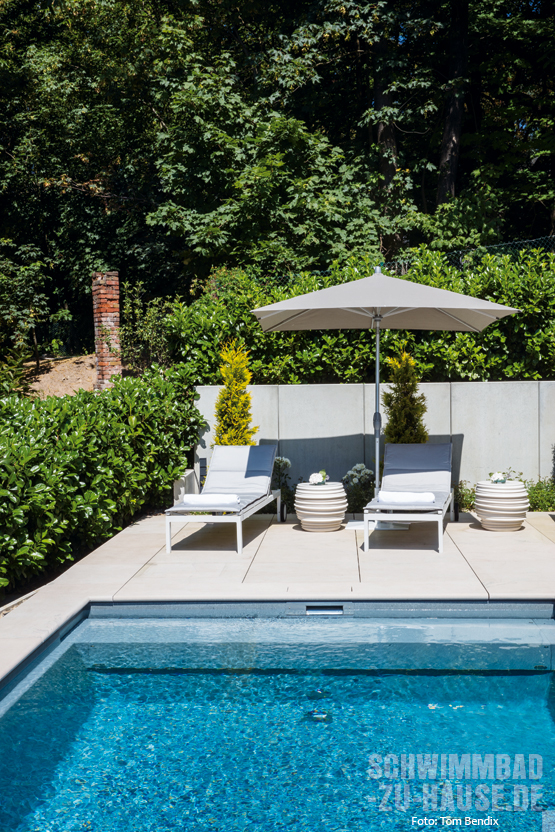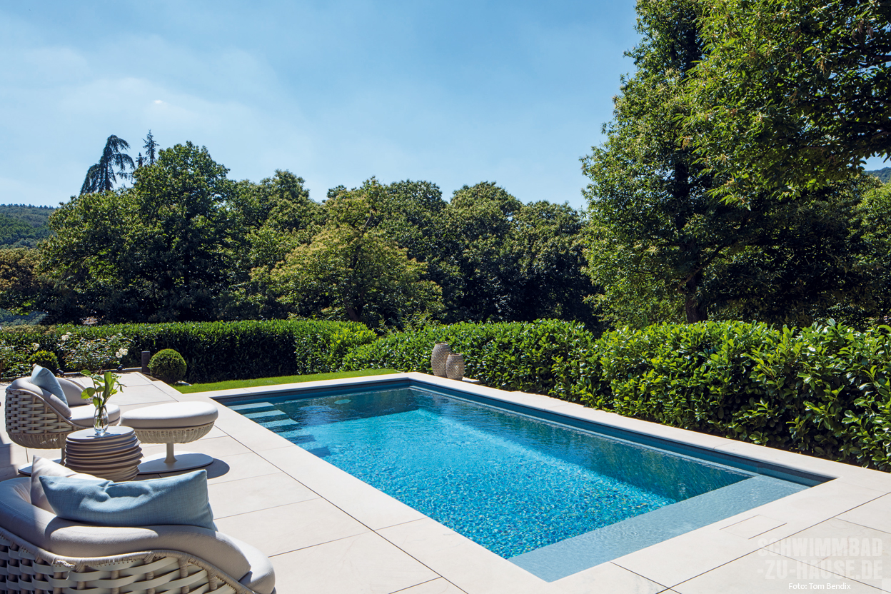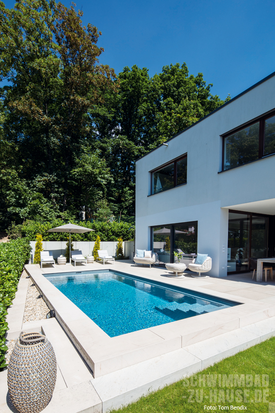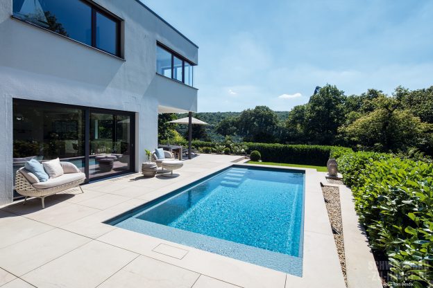 Daher ist langfristig ein eigener Gartenpool die einzig sinnvolle Alternative, um die Familie glücklich zu machen, ohne logistische Planungsspiele durchführen zu müssen. Das dachte sich auch die junge Bauherrenschaft aus der Taunus-Region, die mit dem Heranwachsen der Kinder immer häufiger mit der Schwimmlust des Nachwuchses konfrontiert wurde. Nachdem das neue Anwesen bezogen und damit die Grundlage für eine Verwirklichung des Traums geschaffen worden war, hat sich das Ehepaar immer intensiver mit dem Thema Poolanschaffung beschäftigt. Im Rahmen der bereits fortgeschrittenen Recherche in der Fachpresse ist die Familie auf einen bsw-prämierten Referenzpool von Riviera gestoßen. Aufgrund der dort enthaltenen Kontaktdaten zum beteiligten Bauunternehmen konnte das Ehepaar auf der Webpage der Profis von Steglich Schwimmbadtechnik weitere Einzelheiten zu einem möglichen Pool-Projekt in Erfahrung bringen. Einige Tage später kam schon der Erstkontakt zustande und die Dinge nahmen ihren gewohnten Lauf.