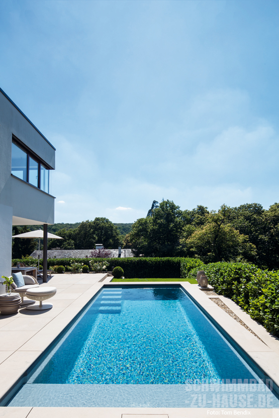 Die junge und selbstbewusste Familie aus der Taunus-Region wollte nicht nur den Erholungswert ihres Gartens erhöhen, sondern vor allem tagtäglich privaten Badespaß unbeschwert genießen. Bei einer Recherche in der Fachpresse stieß die Bauherrenschaft auf einen prämierten Riviera-Pool, der in der Folge die direkte Vorlage für die eigene Traumverwirklichung wurde. Jetzt können die Kids in einen smarten Pool springen, ohne die Eltern bitten zu müssen, mit ihnen ins Schwimmbad zu fahren.