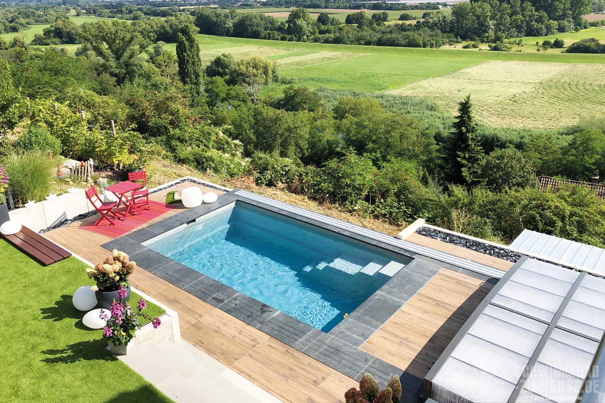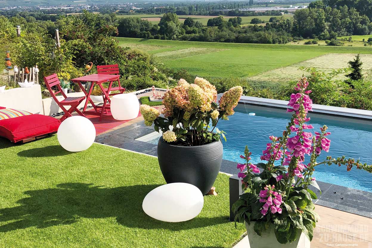 Ein Pool muss nicht besonders groß sein, damit er seinen Zweck erfüllt. Auch ein kleines Becken kann den Garten in eine Entspannungsoase verwandeln, die uns mehr Lebensqualität und Wohlbefinden schenkt. Und genau das wollten die Hausherren für ihr Grundstück mit herrlicher Aussicht auf die Rheinebene.