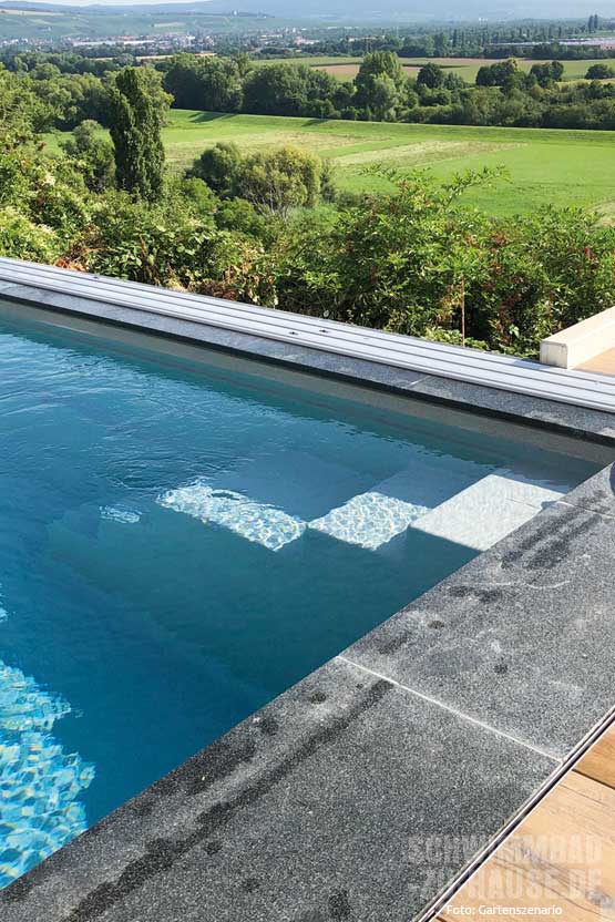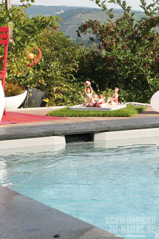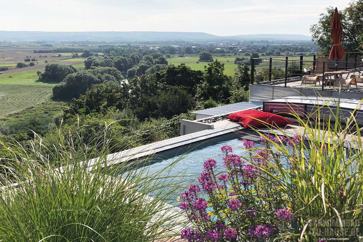 Die Lage des Grundstücks ist zwar ein wunderschöner Platz für den Pool, brachte aber auch besondere Herausforderungen mit sich, da der Hang beim Bau abgefangen werden musste. Wären hier Fehler passiert, hätte dies fatale Folgen haben können. „Nicht jeder kann auf solch einem Areal die Umsetzung korrekt realisieren“, geben die Poolbauer von GartenSzenario zu bedenken. Deshalb sei es wichtig, sich vorher gut zu informieren, die baulichen Anforderungen zu beachten und einen Fachbetrieb zu beauftragen.