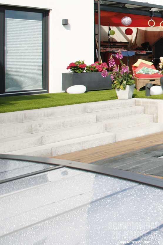 Hinterfüllt wurde das Becken mit einer Spezialisolierung, die zusammen mit den stromsparenden Pumpen den Energieverbrauch senkt. Außerdem entschieden sich die Eheleute für eine Poolüberdachung, mit der sie die Badesaison verlängern und ihren Pool auch dann noch nutzen können, wenn die Temperaturen nicht mehr zum Schwimmen im Freien einladen. Die Überdachung verhindert, dass die Wärme verlorengeht und heizt die Luft über dem Wasser zusätzlich auf, weil sie die Sonnenstrahlen durchlässt.