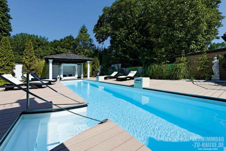 pavillon erst richtig zur Geltung bringt und andererseits sportliches Schwimmen in langen Bahnen ermöglicht. Letzteres ist sogar mit einer Gegenstromanlage möglich.
