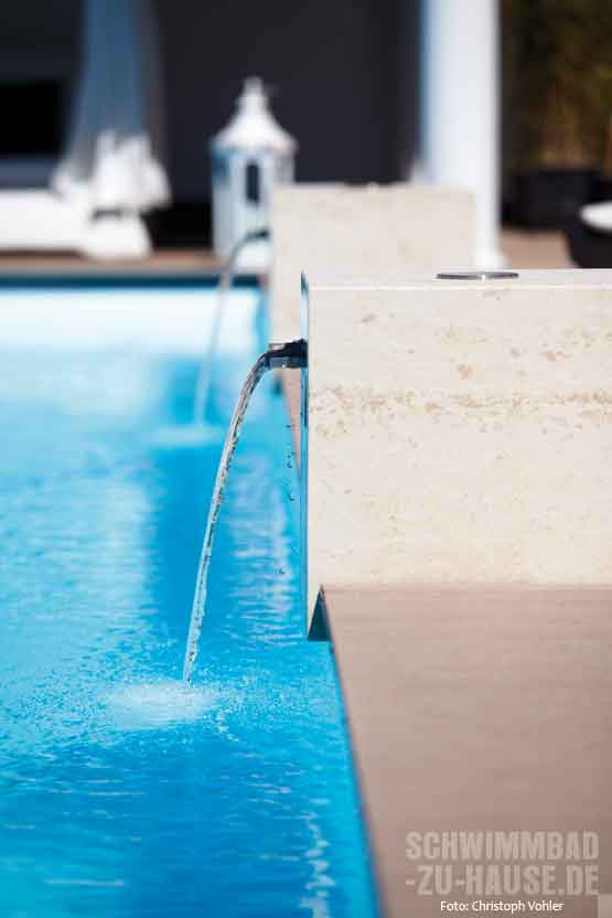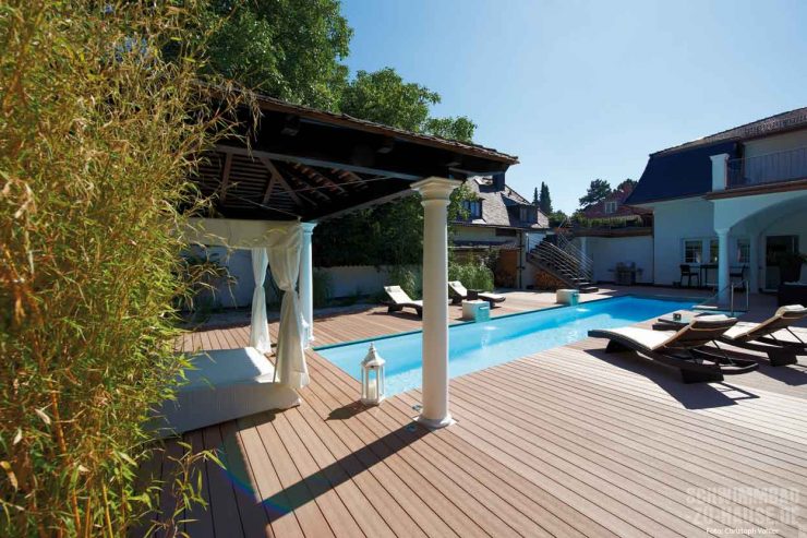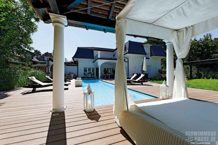 Als wir an diesem Sommertag den Pool der Familie Rothe (Name von der Redaktion geändert) besuchen, lacht nicht nur die Sonne, auch Peter und Aurelie Rothe strahlen, als sie uns von dem Urlaub erzählen, der Ausgangspunkt für dieses herausragende Pooldesign war. „Wir hatten uns in einem kleinen Hotel eingebucht, dessen Highlight ohne Zweifel der Garten mit dem wunderschönen Pool war. Am Kopf des Pools stand ein großes Daybed, auf dem wir unsere erholsamsten Urlaubsmomente verbracht haben. Als wir wieder zu Hause waren, stand unser Entschluss fest: Das wollen wir auch“, erzählt uns Aurelie Rothe. Als Partner für ihr Projekt „Urlaub zu Hause“ wählten die beiden den Architekten Michael Bründl und den Poolbauer Oliver Wilkens, der mit seinem A1 Schwimmbadbau schon so manchen Schwimmbad-Design-Award gewonnen hat, und als Partner der Topras-Gruppe ein ausgezeichnetes Renommee genießt.
