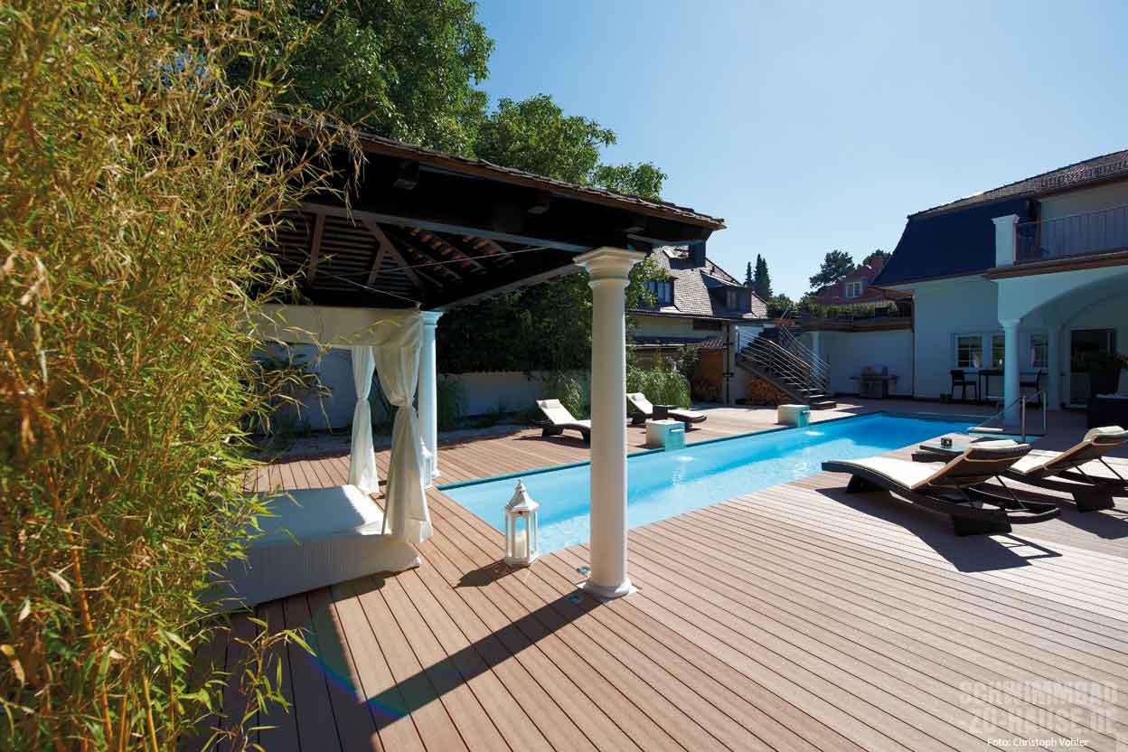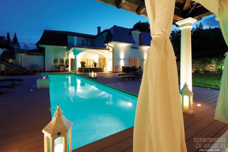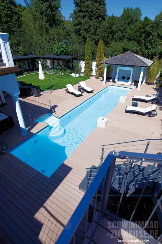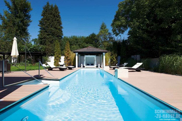 pavillon erst richtig zur Geltung bringt und andererseits sportliches Schwimmen in langen Bahnen ermöglicht. Letzteres ist sogar mit einer Gegenstromanlage möglich.