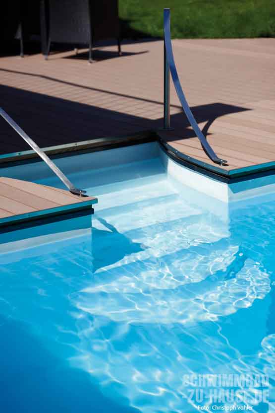 Als wir Oliver Wilkens nach seinem Eindruck fragen, den das Projekt der Familie Rothe auf ihn gemacht hat, sagt der erfahrene Poolprofi: „Selbst wir, die ja nun schon einige Pools gebaut haben, hatten uns auf diese Aufgabe und die Ausführung gefreut. Denn die Gesamtgestaltung der Anlage war von Anfang an in sich sehr stimmig und keineswegs alltäglich.“ Architekt Michael Bründl, der unweit von München sein Büro hat, fügt hinzu: „Ein Garten ergänzt das Gebäude und bringt es zum Strahlen. Er ist Lebensraum und Wohlfühloase.“ Genau diese Wohlfühloase wünschten sich die Hausherren nun für ihren Garten. Entspannung und Erholung waren das Ziel, ohne dabei das Ambiente des Pools und die Gartengestaltung außer Acht zu lassen. So wurde beispielsweise eine beachtliche Schwimmstrecke mit 13,5 Meter Beckenlänge realisiert, indem die Treppe an der Seite des Pools angebracht wurde. Ein gestalterischer Kniff, der auf der einen Seite den Wohlfühl-
