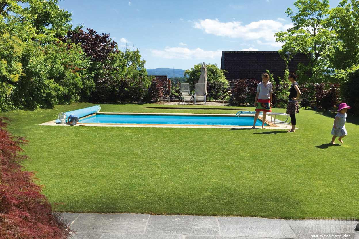 Wenn die Wassertemperatur über 18 Grad liegt, schwimme ich zwei Mal am Tag: Morgens vor der Arbeit etwa 20 Minuten, dann fahre ich mit dem Rad zur Arbeit, und nach der Arbeit schwimme ich noch mal ca. 20 Minuten. Neulich war ich bei 14 Grad mit Neoprenanzug im Wasser, das war dann allerdings doch ein bisschen kühl. Ich überlege deshalb, eine Überdachung für den Pool zu bauen, um auch bei schlechtem Wetter schwimmen zu können.
