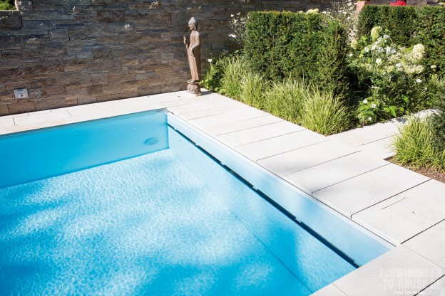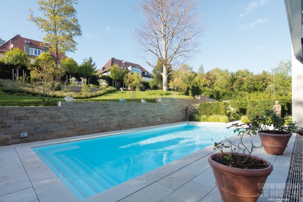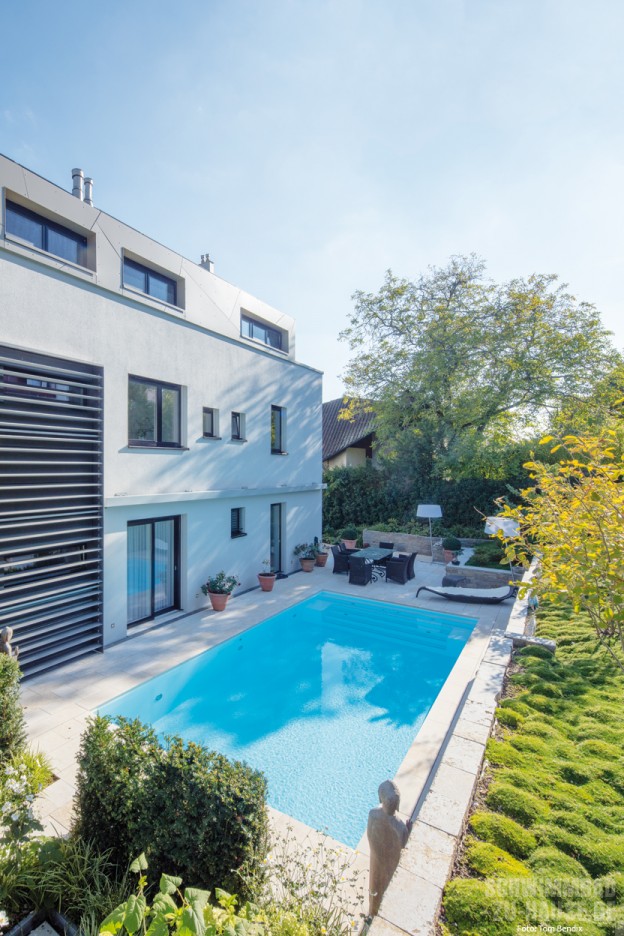 eder private Pool hat seine eigene Entstehungsgeschichte. Diese hier beginnt mit der Vorliebe der Bauherrenfamilie für Sport, Bewegung, Architektur und Wellnesshotels. „Wir wollten aus therapeutischen und gesundheitlichen Gründen ein Becken in unseren Garten integrieren. Da wir aufgrund der Tätigkeit meines Mannes ständig mit interessanten Bauvorhaben konfrontiert sind, hatten wir auch eine genaue Vorstellung, wie unsere Poollandschaft aussehen sollte“, erinnert sich die Bauherrin, Renate Wolff.