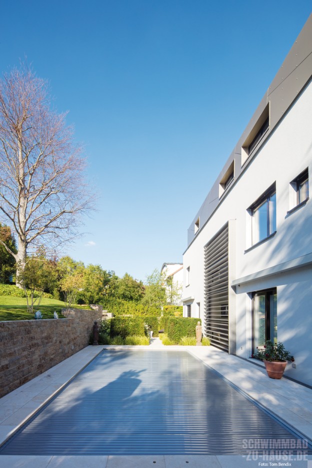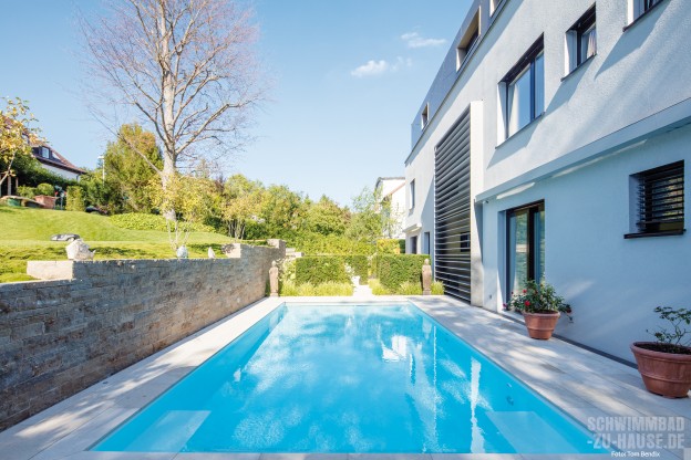Auf der Rückseite ihres Hauses wünschte sich die sportbegeisterte Unternehmerfamilie aus Stuttgart einen Pool. Obwohl die Einbausituation keine einfache war, zauberten die Schwimmbadspezialisten ein elegantes und energiesparendes High-Level-Becken, das unter anderem mit einer hohen Wasserkante beeindruckt. Jetzt steht dem gesundheitsfördernden Schwimmspaß direkt vor der Tür nichts mehr im Wege.