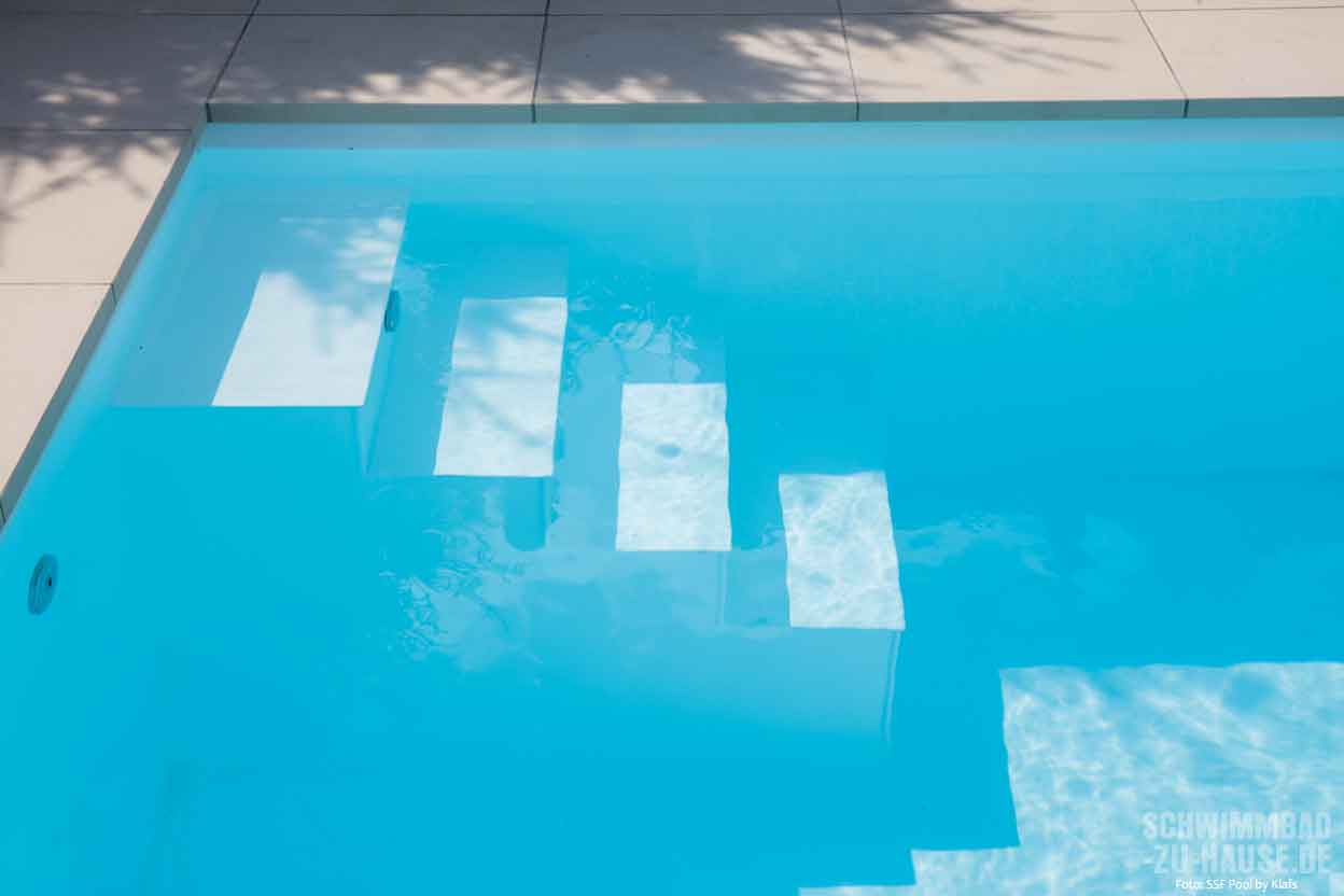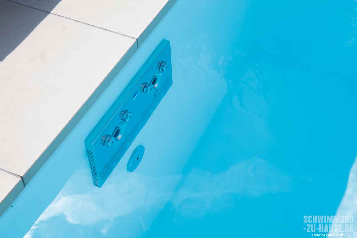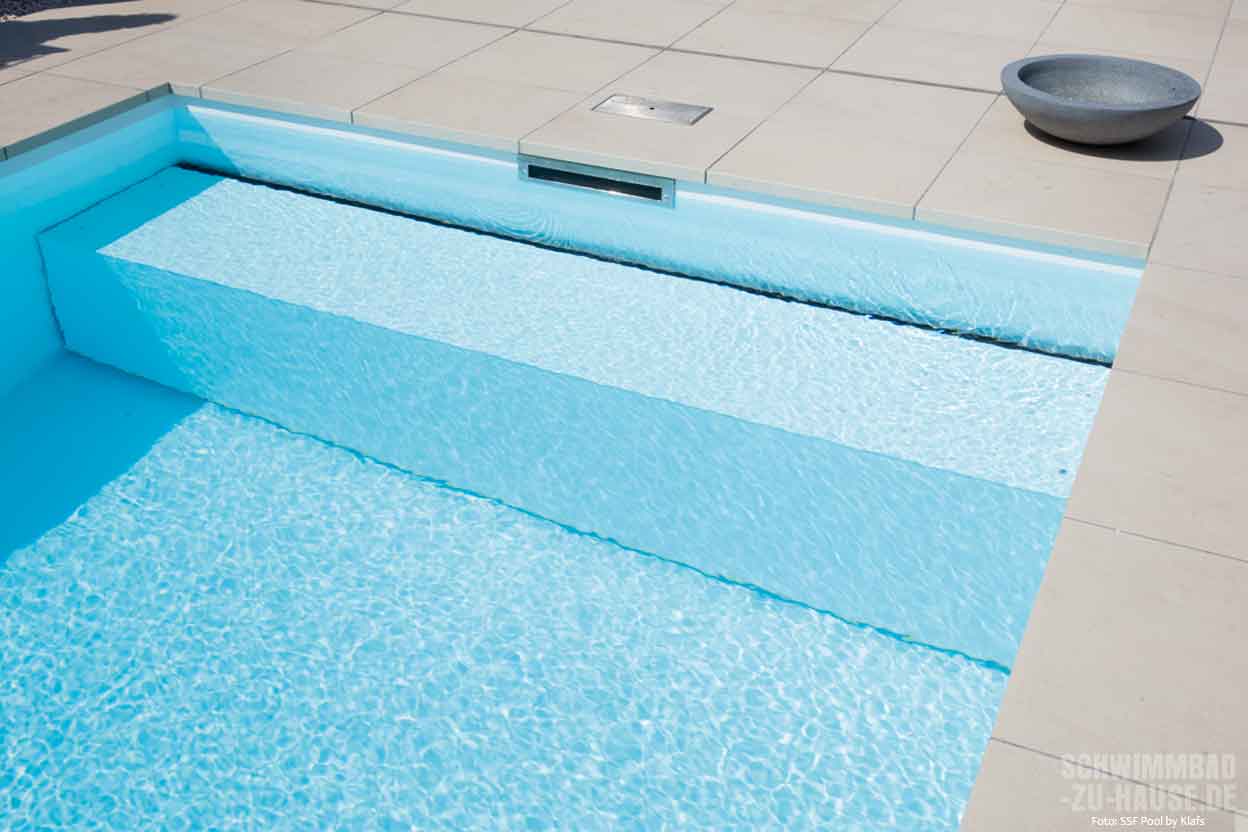 Um im Pool trotzdem eine gemütliche Insel zum Verweilen zu haben, entscheiden sich die Bauherren auf Empfehlung von SSF Pools by Klafs dafür, die Rollladenabdeckung in einer Sitzbank im Becken einbauen zu lassen. Damit das Wasser im Becken nicht nur vorm Auskühlen und Verschmutzen geschützt ist, sondern bei Sonnenschein auch erwärmt wird, ist diese Abdeckung mit Solarprofilen ausgestattet.