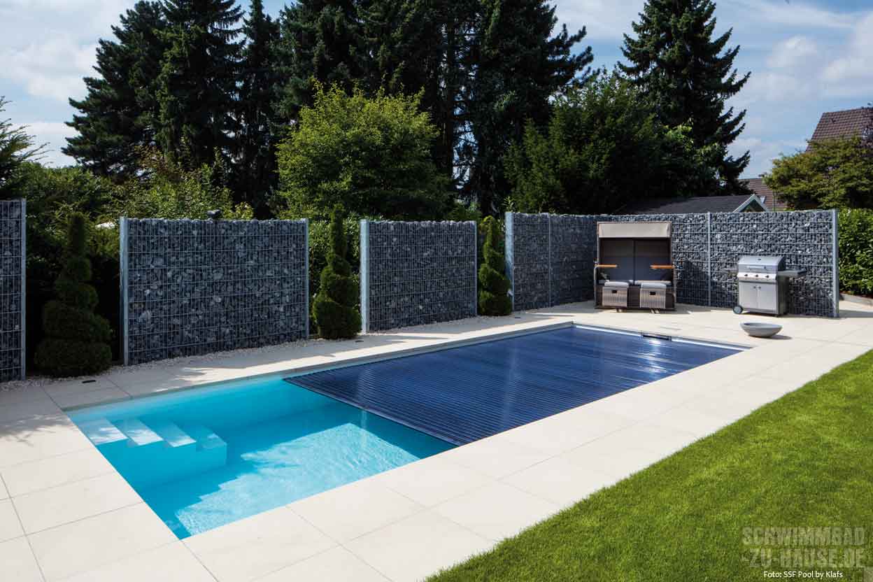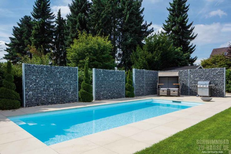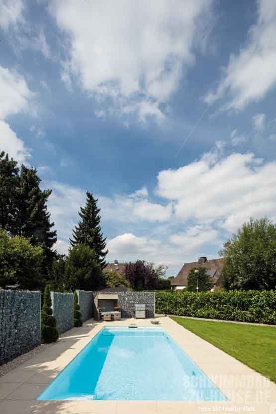 Apropos Schutz: Die Gabionenmauern, die den Pool auf drei Seiten einfassen, dienen nicht nur als Sicht- und Windschutz, sondern verbannen auch geschickt das Gartenhaus, im dem die Poolprofis die gesamte Pooltechnik inklusive der automatischen SSF-Premium-Wasseraufbereitungsanlage platzsparend und wettergeschützt eingebaut haben sowie die Wärmepumpe, die das Pool-Wasser energiesparend auf wohlig-warme Badetemperaturen bringt, aus dem Blickfeld der Bauherren.