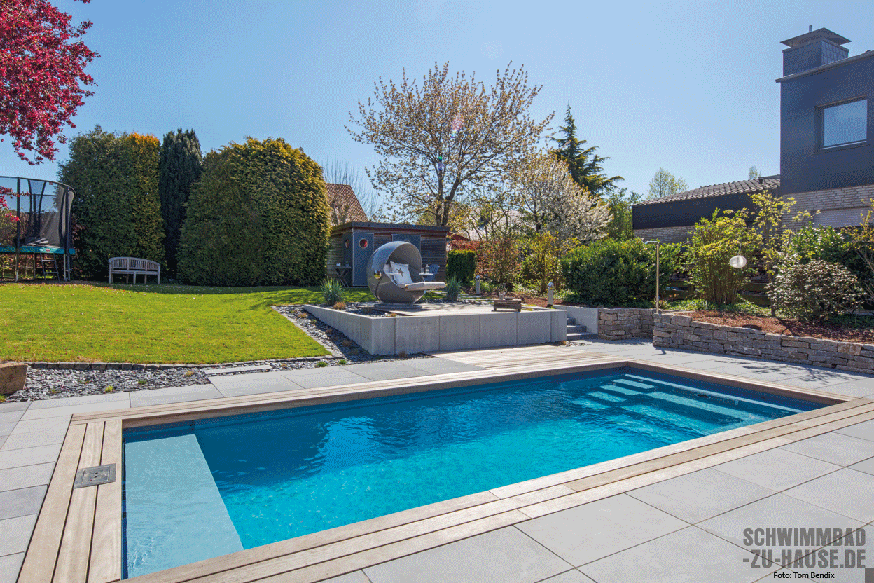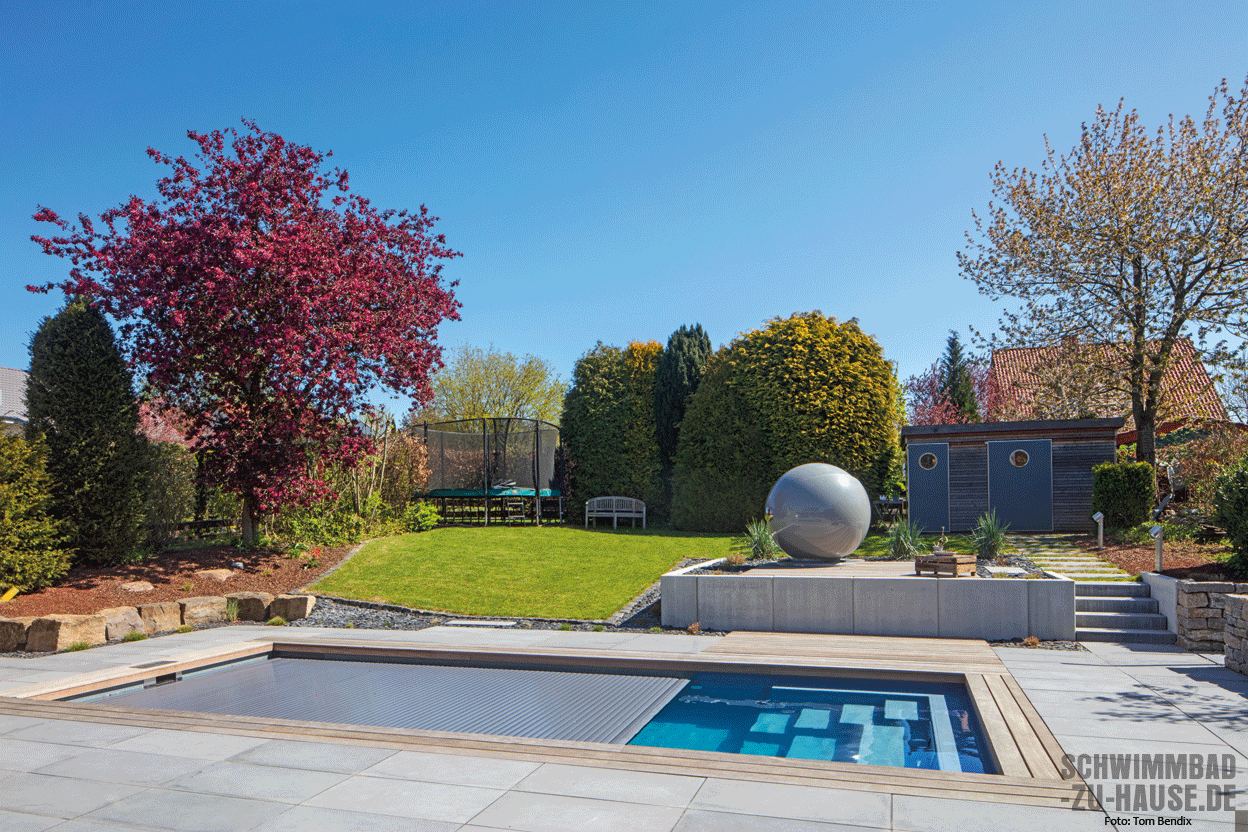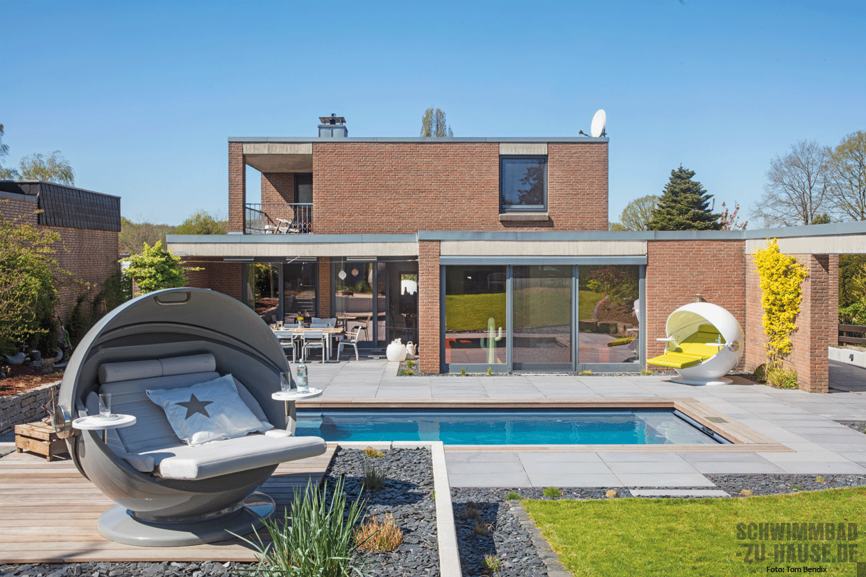 Mit seinem gepflegten Poolgarten in Bünde/Westfalen hat der Hausherr gleich zwei Fliegen mit einer Klappe geschlagen: Die Anlage ermöglicht es ihm, sich zu Hause wie im Urlaub zu fühlen und dient gleichzeitig als Ausstellungsfläche der Firma Sunball GmbH & Co. KG. Die kugelförmigen Relaxkapseln laden nicht nur zum Entspannen ein, sondern ziehen mit ihrem Design unweigerlich die Blicke auf sich.
