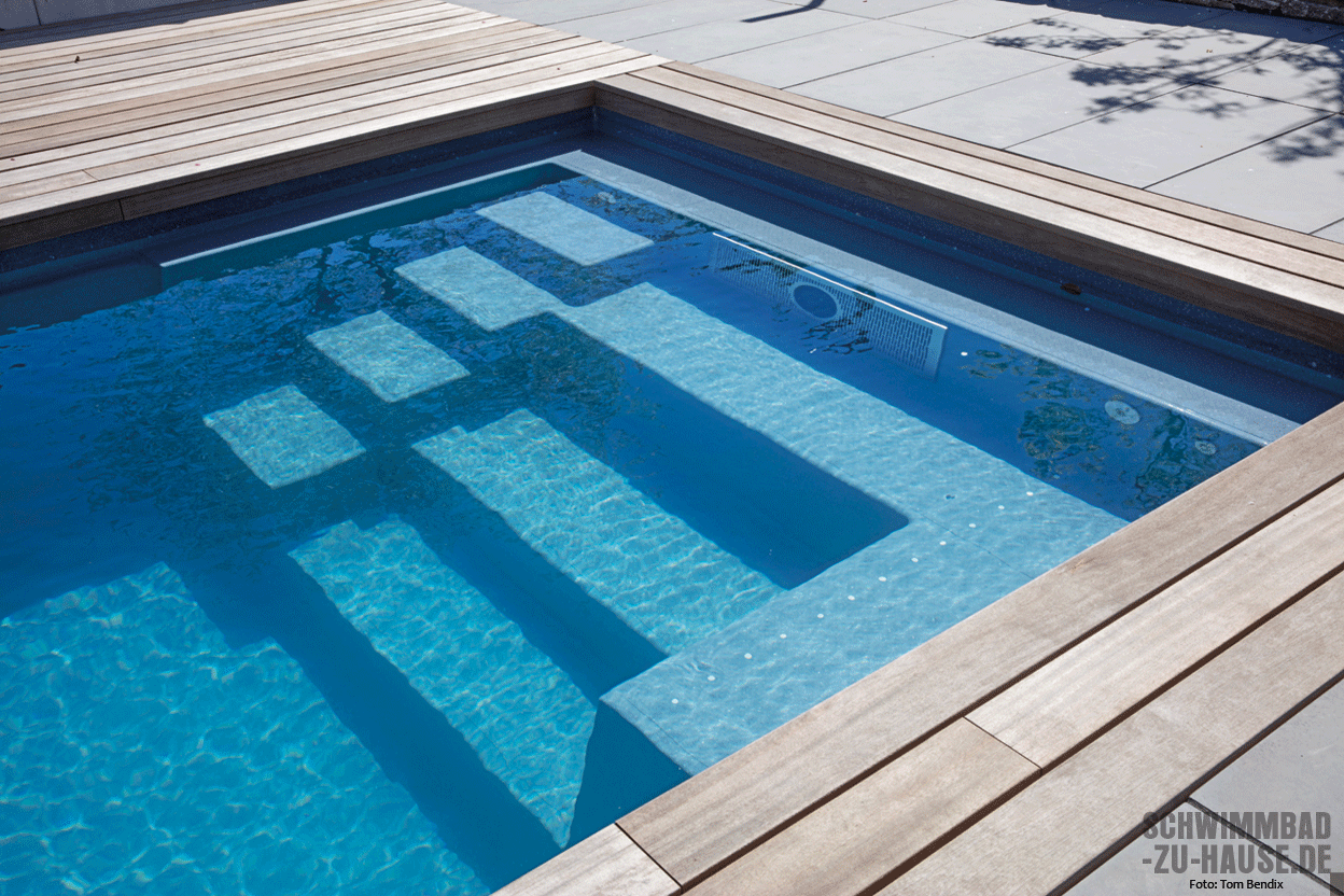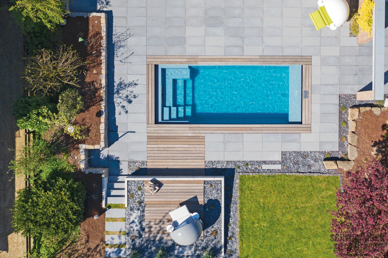 Neben den beiden Sunballs laden ein als Bank dienender Fatboy Attackle, ein schwimmfähiger Poolsitzsack sowie ein Schaukelstuhl zum Relaxen ein. Da der Poolgarten auch Ausstellungsfläche ist, wird er nicht nur von der Familie, sondern auch von Kunden genutzt und erfüllt seine Doppelfunktion zur vollsten Zufriedenheit des Hausherrn. Kleinere Probleme, die beim Bau auftauchten, wurden von den erfahrenen Partnern pragmatisch gelöst. „Ein qualifizierter Gartenplaner und -umsetzer sowie ein erfahrener Schwimmbadbauer sind deshalb am wichtigsten“, rät der Unternehmer allen Poolbesitzern in spe.