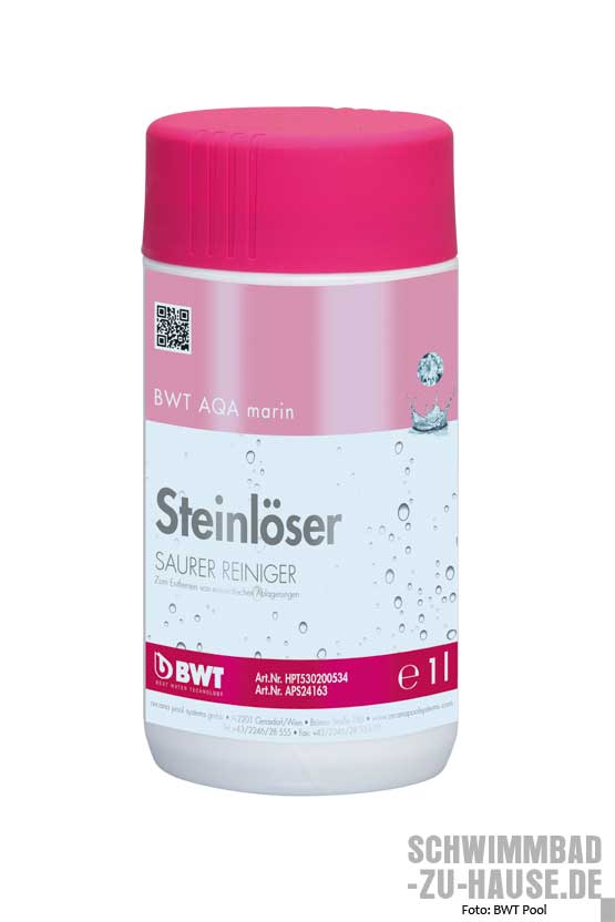 Da die Auswahl an Reinigungsmitteln von Jahr zu größer wird, kann bei allen Schritten ein Mittel passend zum Einsatzzweck ausgewählt werden. Für senkrechte Flächen mit Kalk- und Schmutzablagerungen eignen sich dickflüssige Reiniger, weil sie eine verlängerte Einwirkzeit ermöglichen. Bayrol empfiehlt die Reinigung der Beckenwände mindestens einmal pro Jahr. Besonders geeignet ist das dickflüssige Reinigungsgel „Decalcit Becken“. Basierend auf Salzsäure entfernt es Kalkablagerungen an den Wänden und am Boden des Beckens sehr wirksam. Gleiches verspricht der „Planet Pool Grundreiniger“ der CF Group. Mit dem sauren Reiniger werden Kalkablagerungen und Verkrustungen zuverlässig beseitigt. Anwendbar bei Kunststoffen, sollte der Reiniger nicht mit säureempfindlichen Materialien, wie Marmor oder Beckenarmaturen, in Berührung gebracht werden. Die BWT Pool Products empfiehlt zur Reinigung von Kalkablagerungen den „BWT Steinlöser“, für die Grundreinigung von Wand und Boden das „BWT Randrein-Gel“.
