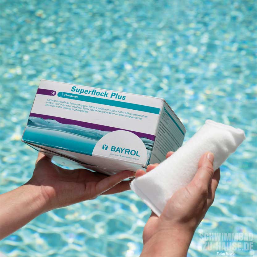 Ein weiterer wichtiger Stoff – außer beim Einsatz von Filterkartuschen und Gewebefiltern – sind Flockungsmittel. Diese sorgen dafür, dass das Wasser nicht von Schwebstoffen, sehr kleinen Schmutzpartikeln und feinst verteilten Verunreinigungen, wie Bakterien, Keimen oder auch Körperfetten getrübt wird. Stattdessen werden kleinste Teilchen vom Flockungsmittel gebunden und sind in der Folge so groß, dass sie gefiltert werden können. Werden Sandfilter – alternativ auch Sandfilter gefüllt mit Filterglas oder Filterbällen – ohne eine automatische Dosieranlage eingesetzt, ist der Skimmer auch der Ort für die Zugabe eines Flockungsmittels. Einfach in der Anwendung sind beispielsweise Flockmittelkartuschen, welche im Skimmer liegend über einen längeren Zeitraum Flockungsmittel abgeben. Noch einfacher ist das Einbringen von Flockungsmittel mit automatischen Dosieranlagen, die ihrem Namen alle Ehre machend, dem Bedarf entsprechend flüssiges Flockungsmittel zudosieren und so für ungetrübten Badespaß sorgen. Sind im Füllwasser Metalle enthalten oder ist das Wasser besonders hart, empfiehlt sich die Zugabe von „BWT Metallneutralisator“. Dieser verhindert Grün- oder Braunfärbung des Wassers durch die gelösten Metalle. Der „BWT Härtestabilisator“ verhindert zuverlässig das Ausfällen von Kalk und Mineralsalzen.
