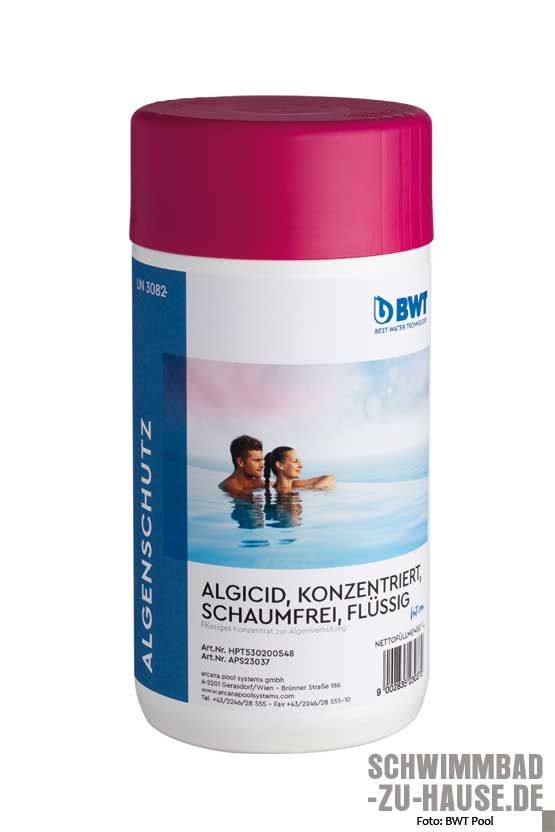 Neben Chlor (oder einem Ersatzstoff) braucht der sommerliche Badecocktail typischerweise auch Algicide zur Algenverhütung. So rät die BWT Pool Products nach der Einstellung des richtigen pH-Werts dazu, ein „BWT Algicid“ zur Algenprävention und ein Desinfektionsmittel zuzudosieren. Alternativ bietet sich auch die „Sopra-Algenverhütung“ an. Bei der Erstbehandlung des frisch gefüllten Pools empfiehlt sich eine größere Menge als für die wöchentlichen Zugaben, die während der Badesaison typisch sind. Ist während dieser eine stärkere Algenbildung zu erkennen, sollte die Menge jedoch kurzzeitig erhöht werden.