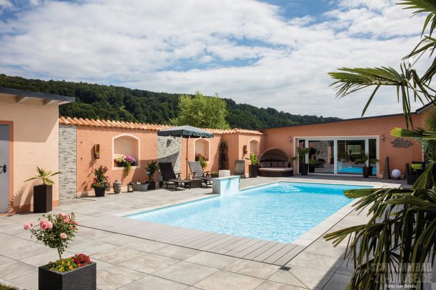 Was waren die Gründe für die Anschaffung des Pools? Um es kurz auf den Punkt zu bringen: Mein Hobby ist der Garten und ein Outdoorpool passt perfekt dazu. Die Idee wurde bereits vor einigen Jahren geboren, als ich sehr häufig in Frankreich unterwegs war, wo Pools schon länger zum Privatgarten dazugehören. Auf der Basis dieser Inspirationen habe ich dann die gesamte Wellnesswelt selbst geplant.