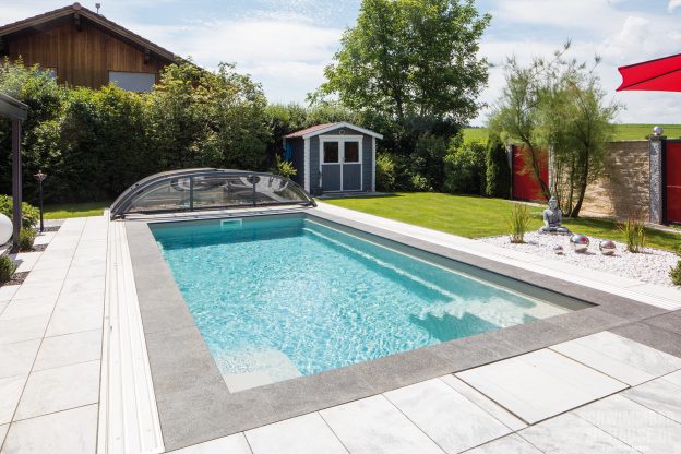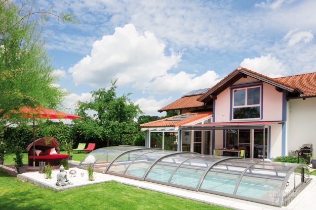 Was würden Sie sagen sind die drei Highlights Ihrer Wellnessoase? Sicherlich ist die Gegenstromanlage ein tolles Feature, das nicht nur unsere sportlichen Ambitionen abdeckt, sondern auch den Kids besonders gut gefällt. Es ist quasi wie ein Laufband, das richtiges Schwimmtraining ermöglicht. Auch die Überdachung, zu der uns der Schwimmbadbauer geraten hat, erweist sich als eine äußerst sinnvolle Anschaffung. Denn so sparen wir uns Zeit und Geld bei der Wasseraufbereitung und verlängern unsere Badesaison, sodass wir von Anfang April bis Ende Oktober selbst an regnerischen Tagen unseren Pool nutzen können.