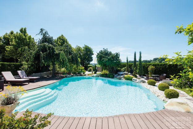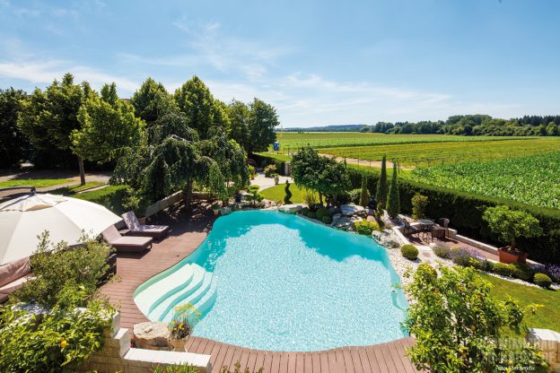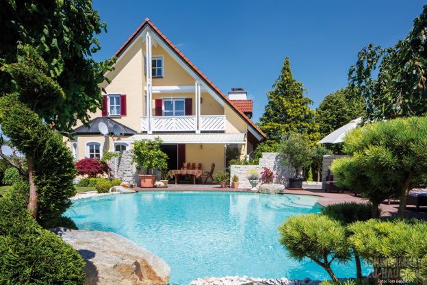 Wie hoch ist der Zeitaufwand, den Sie für die Wasserpflege in der Woche aufwenden? Der Pool, der wie ein Teich aussieht, ist tatsächlich aber ein acht Meter langes und sieben Meter breites GFK-Becken mit vollständiger Wasseraufbereitung. Deshalb muss ich ca. einmal pro Monat eine halbe Stunden investieren, um die Mess- und Dosieranlage zu kontrollieren. Ansonsten entfernt wöchentlich ein Poolroboter den Grobschmutz aus dem Pool.
