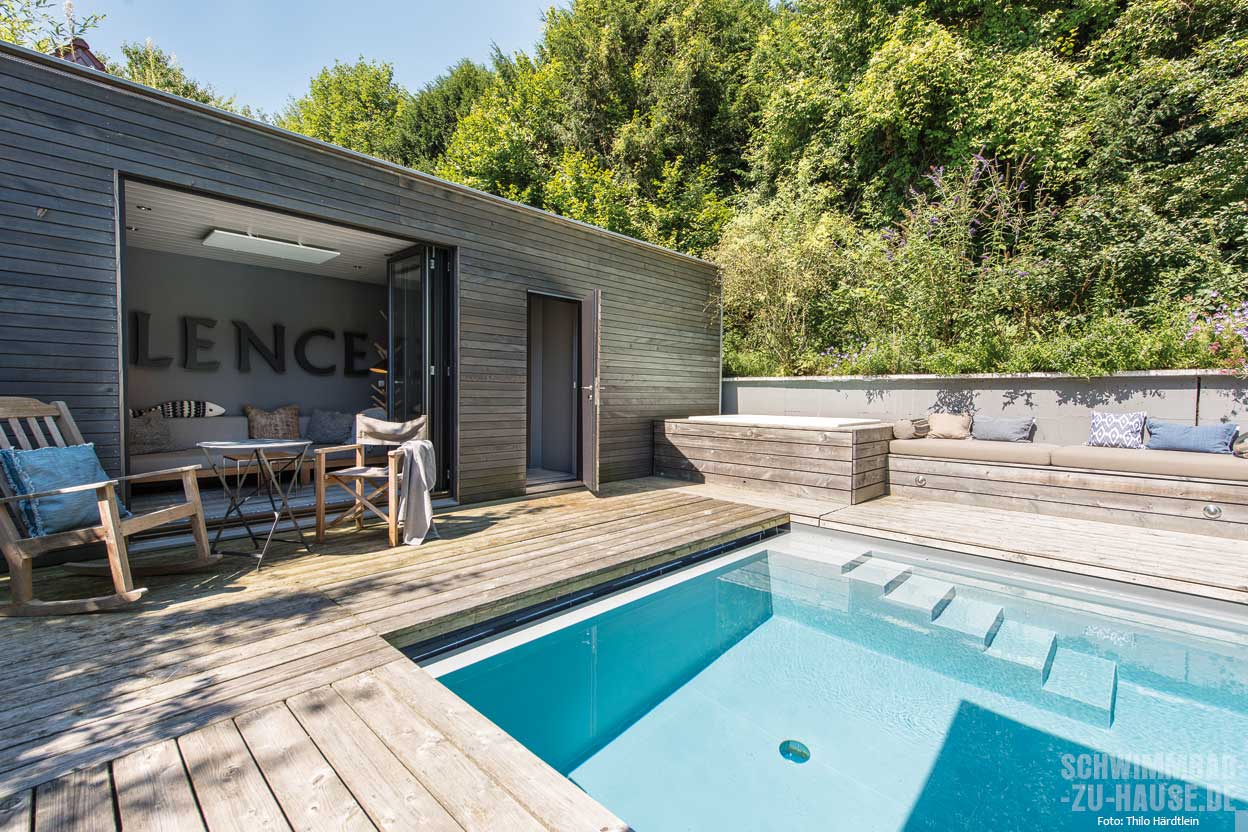Auch ein kleiner Gartenraum, der beispielsweise an sehr heißen Tagen etwas kühlere Luft und Schatten spenden kann, wurde integriert. Gerade für ein geselliges Beisammensein mit Freunden ist der Poolbereich hervorragend geeignet, der nach Ansicht von Oliver Wilkens auch beispielgebend für aktuelle Trends ist: „Die geradlinigen Formen sowie die gelungene Integration des Pools in die Umgebung sind Bauherren bei vielen Projekten aktuell sehr wichtig“. Etwas, was bei diesem Projekt zweifelsfrei gelungen ist. Der Poolbereich wirkt auch im Gesamtkonzept sehr stimmig und steigert die Lust auf warme Sommertage.