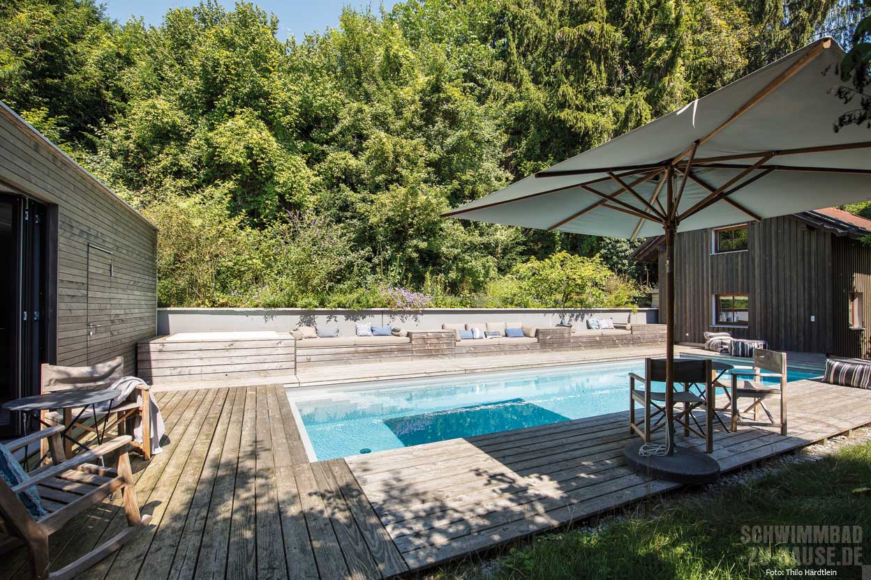 Er sieht das absolute Highlight in diesem Fall im Zusammenspiel der einzelnen Komponenten, vom Becken über den Whirlpool bis hin zum Loungebereich und dessen Materialien sowie der Integration der umliegenden Natur. Und tatsächlich, beim Anblick des neu geschaffenen Gartenreichs kann man verstehen, weshalb es genauso gestaltet wurde – der starke Einbezug von Holz schafft ein äußerst angenehmes Flair, von Stühlen über Sofas bis hin zu Sitzpuffs gibt es zudem für jede Stimmung die passende Sitzmöglichkeit.