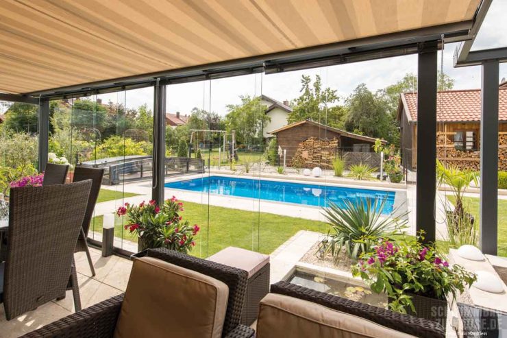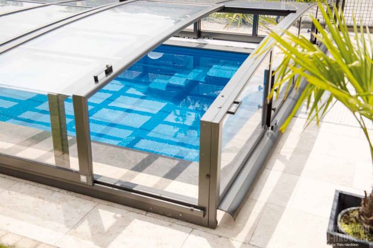 Schmuckstück der Anlage ist auch die stylishe Schwimmbadabdeckung mit nur einer flächenbündigen Laufschiene, die sich stimmig in das Gesamtkonzept einfügt. Dadurch ist auch Möglichkeit gegeben, bei Regen zu schwimmen und so die Poolsaison um einige Monate zu verlängern. Gleichzeitig sorgt die hochwertige Abdeckung dafür, dass der Wärmeverlust in der Nacht und bei Nicht-