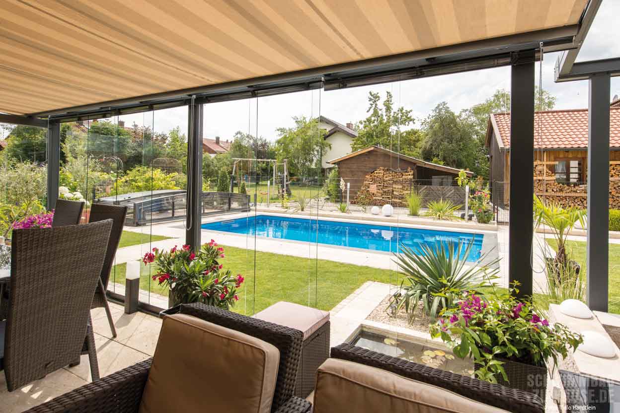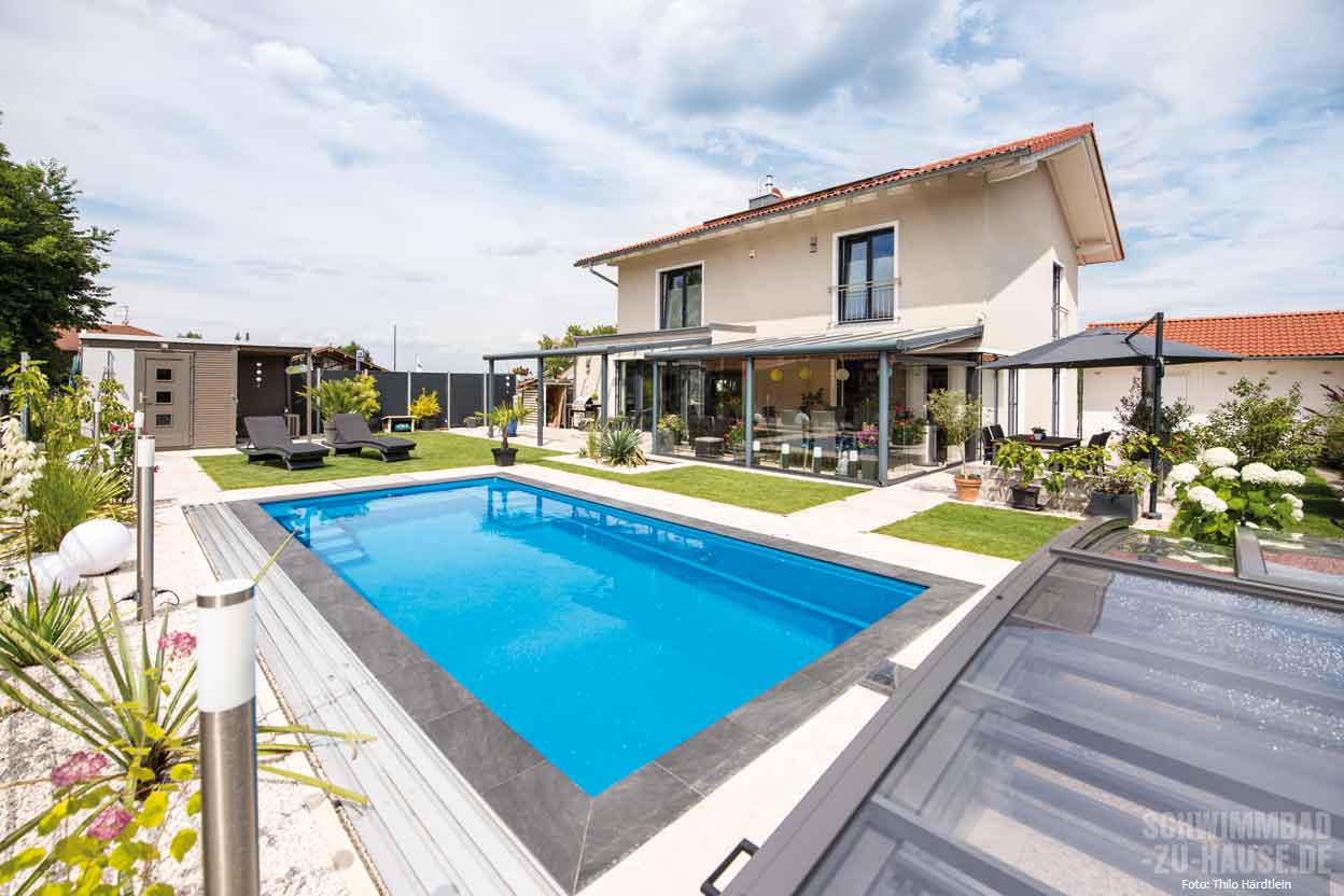 Wenn Träume wahr werden. Schon von klein auf wünschten sich die Bauherren einen eigenen Pool im Garten. Mit seinem tiefblauen Wasser, den geradlinigen Formen und der stylischen Schwimmbadabdeckung ist aus dem Pooltraum ein wahrer Traumpool geworden.
