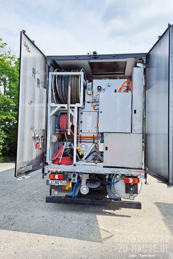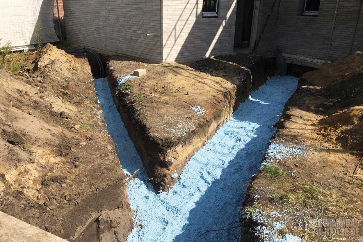 Die Einbringung von Thermaton ist denkbar einfach und schont die Umgebung des Gartens. Die speziell ausgerüsteten Lkws mischen das Material direkt auf der Baustelle an und pumpen es über flexible Schläuche bis zu einer Entfernung von 150 Meter an den Einbauort. Dies sorgt nicht nur für eine saubere Baustelle, sondern auch für eine präzise und ressourcenschonende Verarbeitung. Da Thermaton erst vor Ort angemischt wird, ist die Berechnung der benötigten Menge unkompliziert. Es wird stets die tatsächlich verbrauchte Menge abgerechnet, wodurch sich unnötige Kosten und Abfall vermeiden lassen. Ein weiterer Vorteil ist die spezielle Maschinentechnik, die auf der Baustelle lediglich einen Wasseranschluss benötigt. Ein Stromanschluss ist nicht erforderlich, da die Lkws mit leistungsstarken Stromaggregaten ausgestattet sind und den benötigten Strom selbst produzieren.