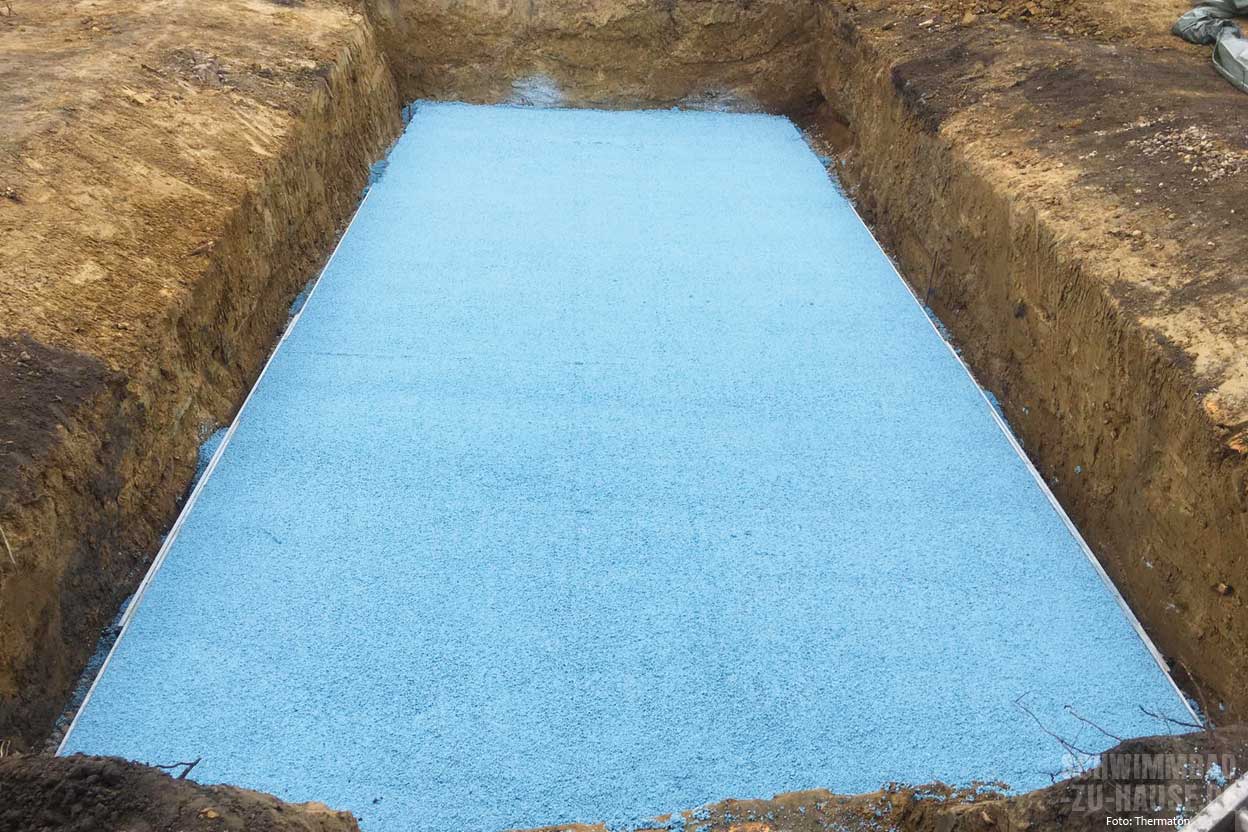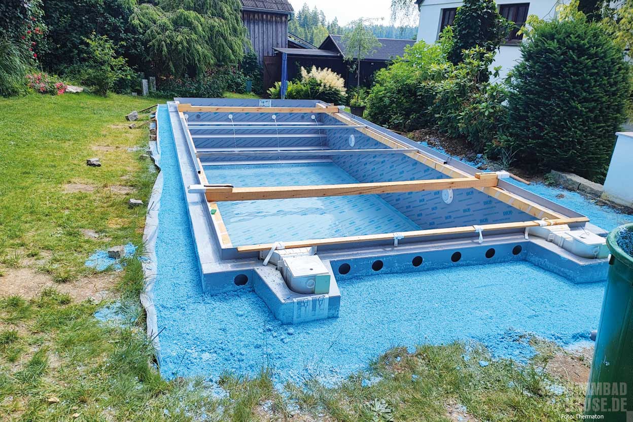 Ein besonderes Highlight ist die Möglichkeit, mit „Thermaton Terra“ eine wärmedämmende Bodenplatte herzustellen, die speziell für GFK- und PP-Becken geeignet ist. Diese Bodenplatte ersetzt gleichzeitig die Drainageschicht und bietet eine optimale Grundlage für die Poolwanne. Nach der Installation und Verrohrung des Beckens wird der Hohlraum zwischen Erdreich und Becken mit „Thermaton Expleo“ hinterfüllt. Diese Lösung bietet nicht nur hervorragende Dämmeigenschaften, sondern schützt auch die Poolkonstruktion. Thermaton umhüllt das Becken samt Rohrleitungen vollständig, was zu einer Erhöhung der Wassertemperatur um bis zu vier Grad führt. Das bedeutet nicht nur mehr Komfort für die Nutzer, sondern auch eine erhebliche Einsparung bei den Heizkosten.