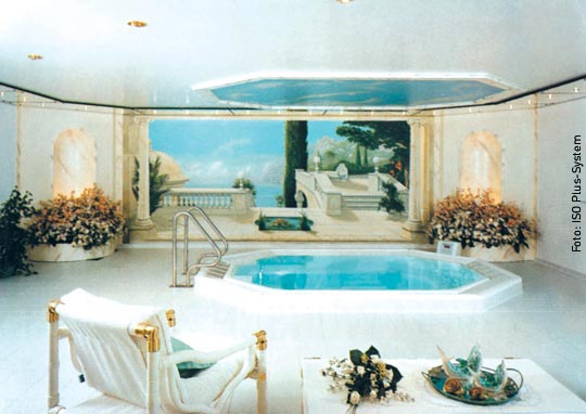 Bedingt durch die permanent hohe Luftfeuchte sind die Klimabedingungen für den Gips auf Dauer nicht zuträglich. Er sättigt sich mit Feuchte aus der Luft bis zu einer Ausgleichsfeuchte, die so hoch liegt, dass die kristalline Struktur des Gipses gefährdet ist. Aus diesem Grund wird Gips, sei es in Form von Putz oder Platten, in Schwimmhallen nicht eingesetzt. Doch es gibt gipsfreie Bauplatten, wie etwa die „ISO-Feuchtraum-Paneele“, die nahezu genauso zu verarbeiten sind wie Gipsbauplatten. Sie halten der permanent hohen Feuchtebelastung in Schwimmhallen auf Dauer stand. Die Paneele werden an die Unterkonstruktion geschraubt und dann von der Unterseite verspachtelt und fugenlos verputzt. Und da diese Paneele (Fläche: 2,5 x 1,2 Meter) gebogen, gebohrt oder gesägt werden können, wird eine individuelle Schwimmbaddeckengestaltung möglich. Für eine gute Optik – denn das Auge schwimmt mit.
