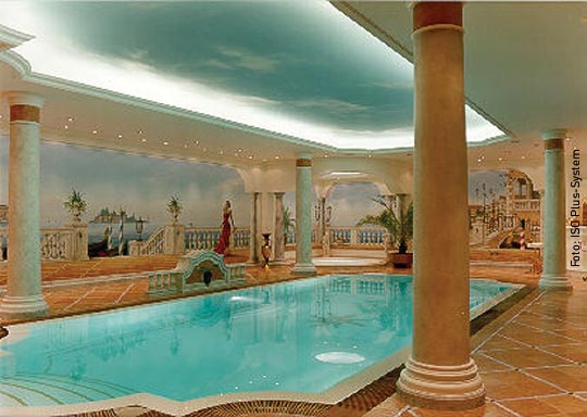 Anders ist die Situation bei Rohbauhöhen ab 2,5 Metern – dann wird eine abgehängte Decke möglich. Als Empfehlung sollten bei einer zeitgemäßen Schwimmhalle allerdings mindestens 2,8 Meter als Rohbaumaß zur Verfügung stehen. Eine durchgehend abgehängte Decke ermöglicht schon viel mehr Spielraum, etwa bei der Integration von Beleuchtung und Lautsprechern – eine noch elegantere Lösung ist jedoch die Abhängung in Stufen. Sie lässt hinsichtlich der optischen Gestaltung keine Wünsche offen: unterschiedliche Höhenniveaus, indirekte Beleuchtung, integrierte Niedervoltstrahler oder Sternenhimmel als abendliche Traumkulisse? Die vielfältigsten Wünsche sind realisierbar. Weitere Vorzüge: Lüftungskanäle, Elektro- und Lautsprecherkabel verschwinden hinter der Abhängung, und Lüftungsgitter werden überflüssig, weil im Hohlraum zwischen der Decke die Luft abgesaugt werden kann. Kein Wunder, dass in der Praxis immer mehr die teilweise abgehängte Decke realisiert wird. Sie bietet alle technischen Vorteile bis hin zur deutlichen Verbesserung der Akustik und ermöglicht zudem elegantes und individuelles Design.