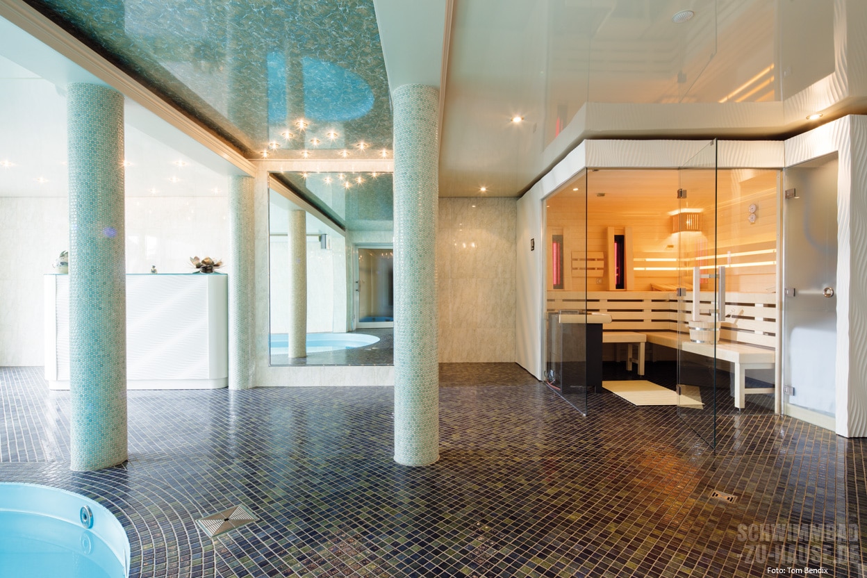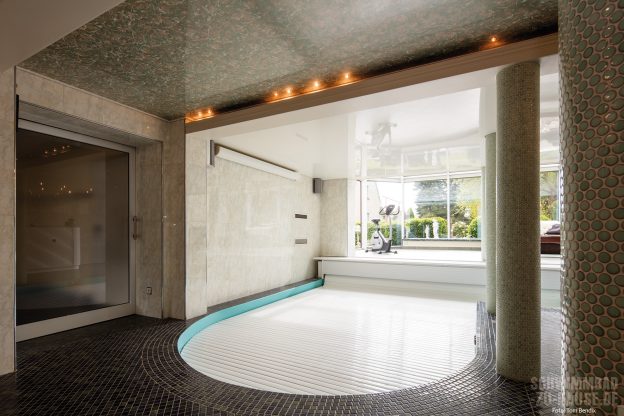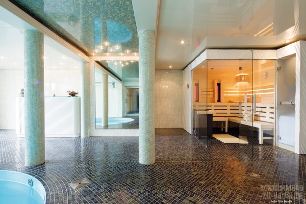Nach detaillierter Planungsphase wurde ein geschlossenes Konzept entworfen, das nicht nur einen hohen Grad an Entspannung garantieren sollte. Denn die erfahrenen Wellnessprofis konzentrierten sich darauf, eine bauphysikalisch ausgereifte Wellness-Indoor-Welt zu bauen, die energieeffizient und zugleich leicht zu bedienen ist. So wurde ein Überflurrollladen montiert, der die Verdunstung verhindert und samt Entfeuchtungsgerät und der Dampfsperre für ein angenehmes Wohlfühlkima sorgt. Um den Geldbeutel und die Umwelt noch stärker zu entlasten, entschloss man sich, die Fußboden- und Wandheizung über ein Blockheizkraftwerk zu versorgen und den Strom mit einer autarken Photovoltaikanlage zu produzieren. Damit bei der Wasseraufbereitung der Komfort großgeschrieben wird und alles automatisch abläuft, wurde der Pool-Manager von Bayrol samt einem automa-tischen „Badutronic“-Rückspülventil verbaut.