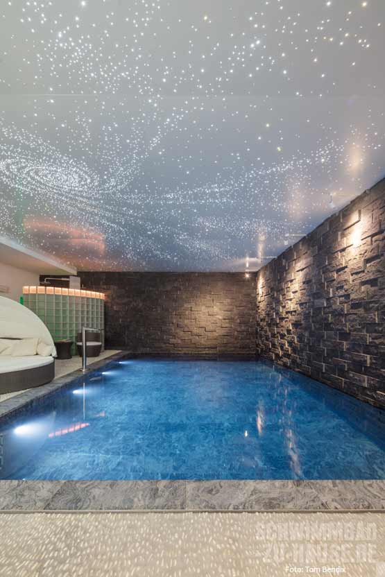 Letztendlich wurden alle familiären Wünsche erfüllt, sodass die Bauherren heute sportliche Bahnen in dem 9,50 Meter langen und 4,70 breiten Betonbecken mit Gegenstromanlage ziehen können. Damit das Raumklima des Indoorpools immer perfekt bleibt und die Klima- und Entfeuchtungsanlage durch Verdunstung nicht in Mitleidenschaft gezogen wird, entschloss sich der