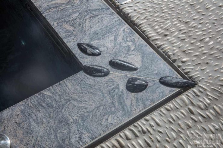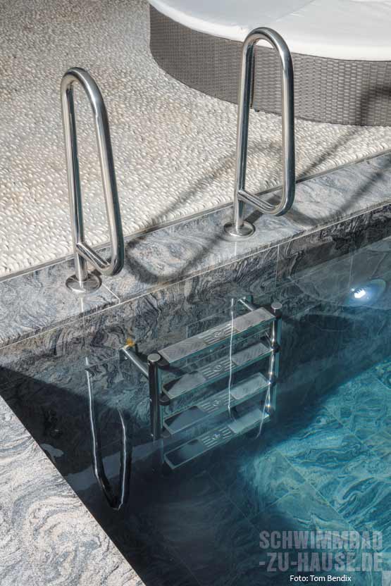 Bauherr, auch einen Unterflurrolladen montieren zu lassen. Er selbst bekam sein Dampfbad, der Sohn das Fitnessstudio und die Hausherrin den Whirlpool mit Überlauf. Als weitere Wasserattraktion wurde eine Nackenschwalldusche angebracht und der Pool mit einer vollautomatisierten Wasseraufbereitung ausgestattet. Damit alle Komponenten bequem bedient werden können, steht der Familie eine smarte Poolsteuerung zur Verfügung.