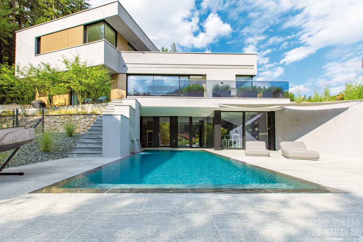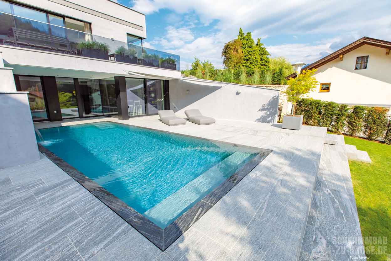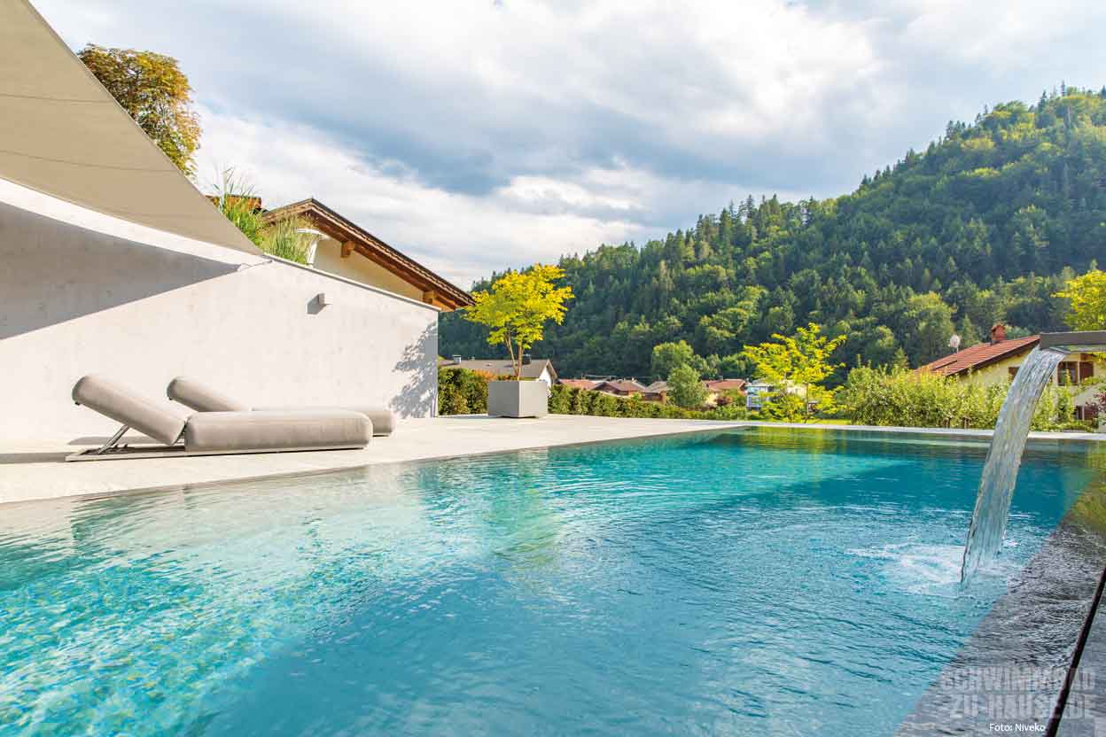 Partner SST Saurwein Schwimmbad Technik, wonach er suchte. Diese entschied sich in Absprache mit dem Bauherrn für das Modell „Überlauf Advance“ mit den Maßen 9,00 x 3,50 Meter. Herr Fechter zeigte sich begeistert vom Ablauf des Einbaus: „Das Material, aus dem die Pools bei Niveko hergestellt werden, sagte mir von Anfang an zu. Die Becken werden in einem Stück geliefert, inklusive Armaturen und Rohrleitungen – da musste ich nicht lange überlegen.“ Auch der geringe Reinigungsaufwand sagt dem frischgebackenen Poolbesitzer zu: „Der Pool reinigt sich nahezu von selbst und auch die Filtertechnologie und die Wasseraufbereitung funktionieren einwandfrei“, so Fechter.