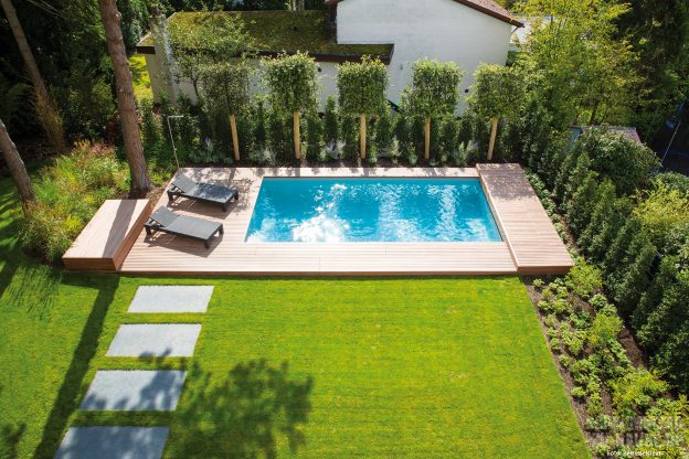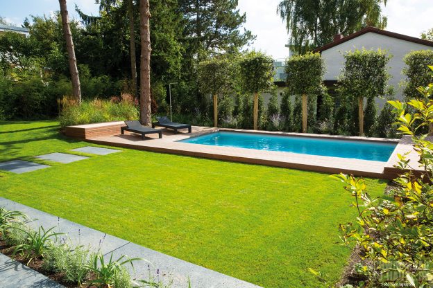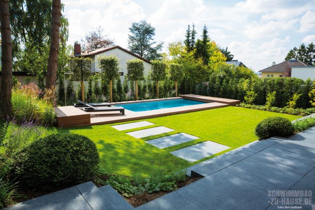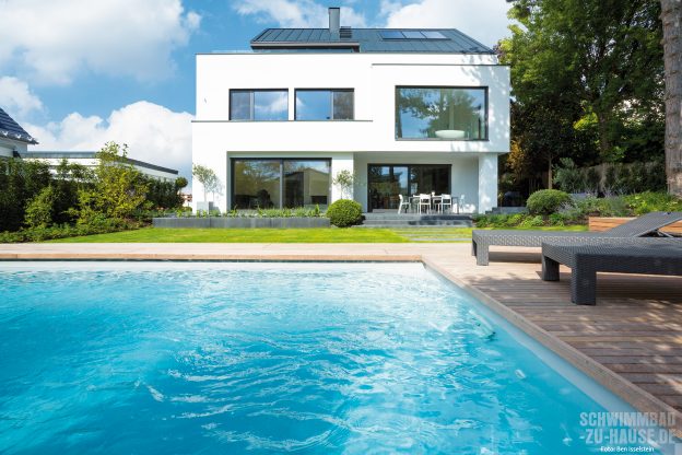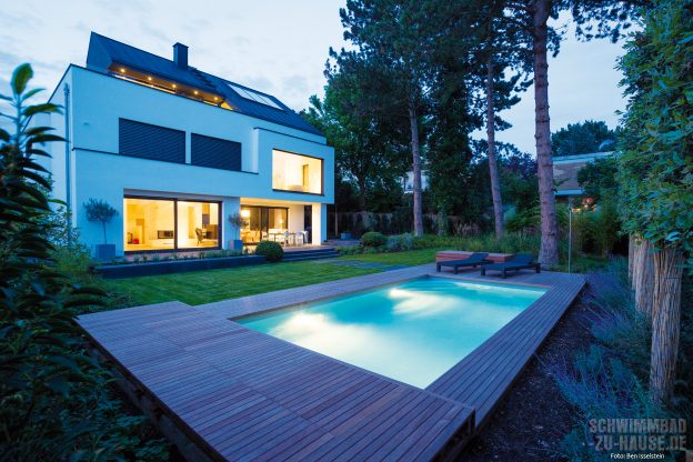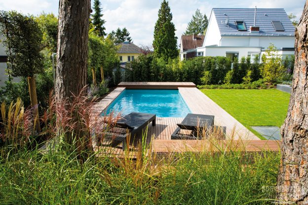 Ein privates Refugium wie aus dem Bilderbuch – So kann das Anwesen dieser jungen Familie aus Wiesbaden beschrieben werden. Das großzügige moderne Wohnhaus im zeitgemäßen Bauhausstil ist bestimmt durch eine markant gerade Formensprache. Ihm zu Füßen erstreckt sich ein traumhafter Garten, dessen Begrenzung aus hohen, alten Bäumen besteht. Das Highlight dieses Gartens ist jedoch ein schlichtes, rechteckiges Schwimmbad. Es ist parallel zum Haus positioniert und fügt sich harmonisch in den Garten ein. Eine sich der Form des Beckens anpassende Holzumrandung betont dabei den geradlinigen Charakter der privaten Wellnessoase.