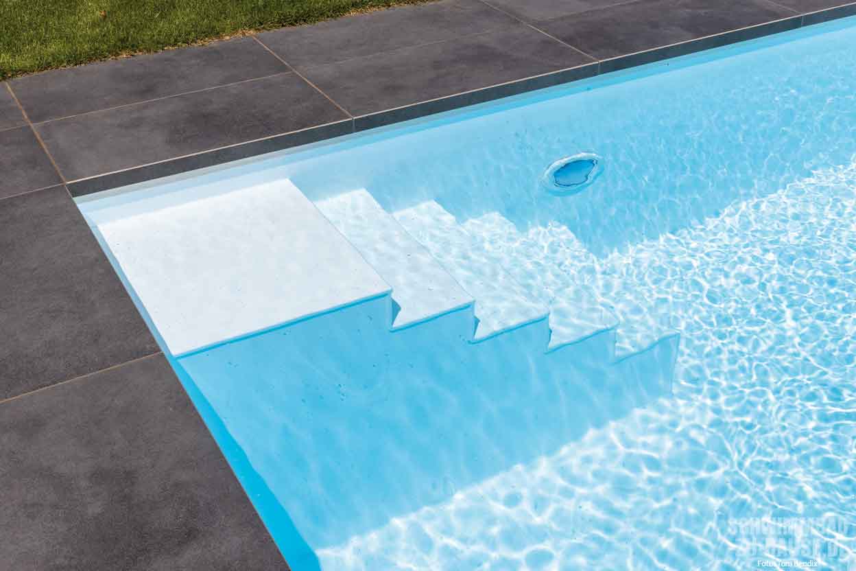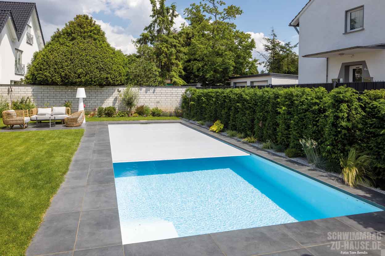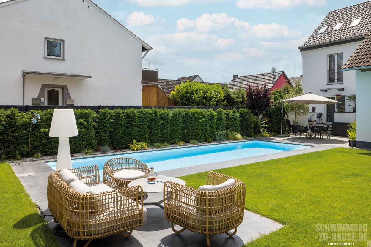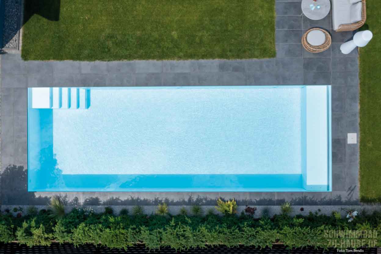 Möglichst lang sollte er sein, der Pool dieser Bauherren aus Nordrhein-Westfalen. Gestaltungstechnisch setzten sie auf moderne Geradlinigkeit und schnörkellosen Purismus. Entstanden ist ein 19 Meter langes Schwimmbecken mit zeitlosem Charakter und hochwertigster Technik.