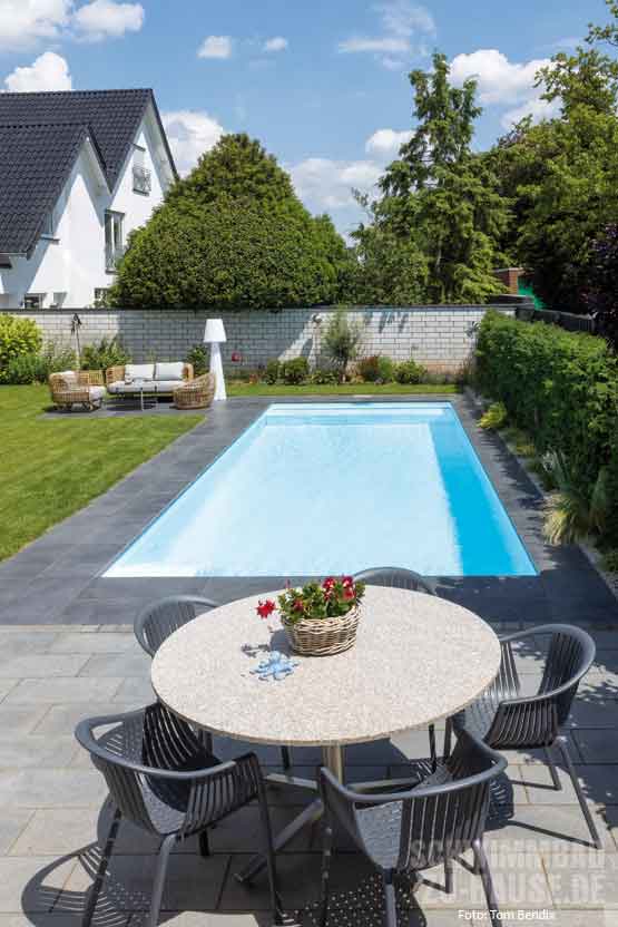 Mit seinen stattlichen Abmessungen 10,00 x 3,50 x 1,50 Meter bildet das weiße Fertigbecken mit Rollo-Sitzbank und moderner Einstiegstreppe jetzt das neue Zentrum des Gartens. „Die größte Hürde stellte die Platzierung des Pools mit Abgrenzung zur Straße dar“, erinnert sich Müller. Mithilfe einer kreativen Idee des Gartenbauers durch Sichtschutzhecke und –mauer wurde dies allerdings rasch gelöst. Eingefasst wird der Pool durch eine anthrazitfarbene Natursteinumrandung, die einen ästhetischen Kontrast zur hellen Beckenfarbe des Skimmerbeckens bildet.
