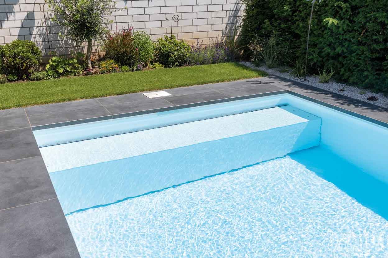 Da hauptsächlich der Bauherr selbst den Pool zum Schwimmen nutzt, der Rest der Familie jedoch das Wasser zur Entspannung und zum Wohlfühlen nutzt, soll das Wasser stets eine angenehme Temperatur von 26 bis 28 Grad aufweisen. Dies garantiert eine Kombination aus energiesparender Luft-Wärmepumpe und in das Becken integrierter Unterflur-Rollladenabdeckung aus weißem PVC von Grando. Letztere wird über die Wasseroberfläche gefahren, wenn die Familie den Pool nicht nutzt. Dies verhindert zum einen die Verschmutzung des Wassers durch Äste sowie Laub und minimiert den Wärmeverlust.