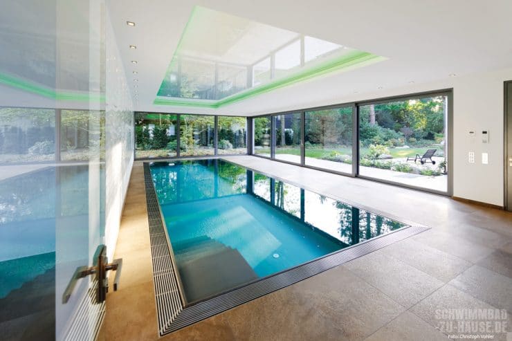 Heute können sowohl Eltern als auch Kinder in einem zehn Meter langen Betonfolienbecken mit einem Überlauf aus Edelstahl ganz privat ihre Bahnen ziehen oder einfach nur spielen, ohne den Trubel öffentlicher Badeanstalten in Kauf nehmen zu müssen. Eine vollautomatisierte Wasseraufbereitung garantiert tagtäglich glasklaren Badespaß. Damit die Halle auch in Sachen Energieeffizienz up-to-date ist, wurde neben der smarten Poolsteuerung ein Rollladen, ein Niedertemperatur-Wärmetauscher sowie eine frequenzgesteuerte Filterpumpe verbaut.