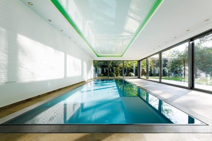 Heute können sowohl Eltern als auch Kinder in einem zehn Meter langen Betonfolienbecken mit einem Überlauf aus Edelstahl ganz privat ihre Bahnen ziehen oder einfach nur spielen, ohne den Trubel öffentlicher Badeanstalten in Kauf nehmen zu müssen. Eine vollautomatisierte Wasseraufbereitung garantiert tagtäglich glasklaren Badespaß. Damit die Halle auch in Sachen Energieeffizienz up-to-date ist, wurde neben der smarten Poolsteuerung ein Rollladen, ein Niedertemperatur-Wärmetauscher sowie eine frequenzgesteuerte Filterpumpe verbaut.