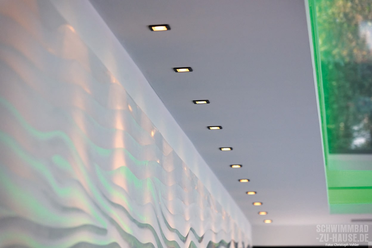 Der Schwimmbadspezialist erklärt uns zudem, dass neben den grundlegenden Entscheidungen die Bauherren sich auch über einzelne Details Gedanken machen und mit den Schwimmbadspezialisten intensiv besprechen sollten. Bei diesem Projekt stand neben der vollautomatisierten und smarten Wasseraufbereitung das Beleuchtungskonzept sowie das Zusammenspiel der unterschiedlichen Farben und Materialien im Zentrum der Aufmerksamkeit.