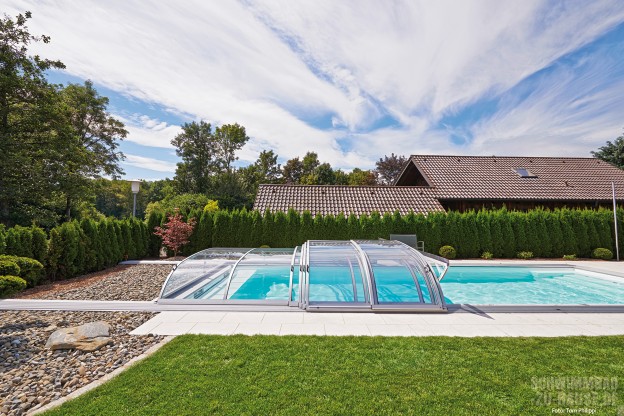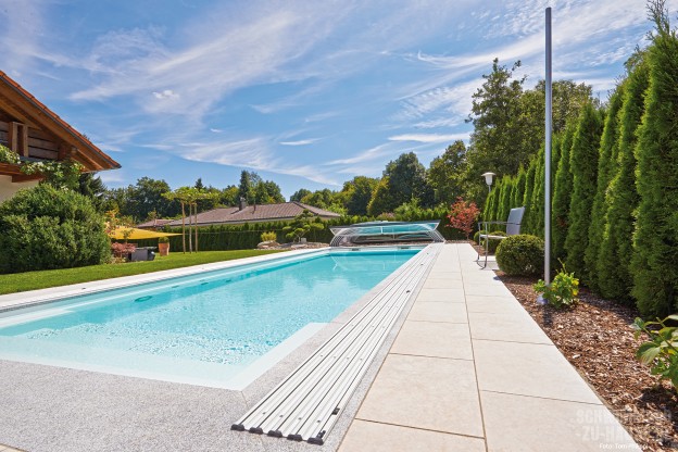 Sonne und Erholungsmöglichkeiten gibt es am Bodensee zur Genüge. Da fehlte den Bauherrn zum vollkommenen Glück eigentlich nur noch eines: ein eigener Pool in der geschützten Privatsphäre des heimischen Gartens und dies das ganze Jahr über. Dank Schiebehalle und Solar-Unterflurrollladen kann die Familie jetzt zu jeder Jahreszeit schwimmen.