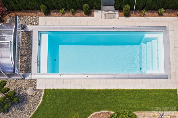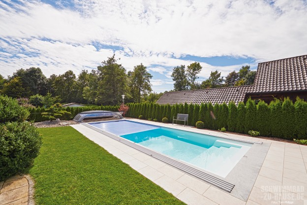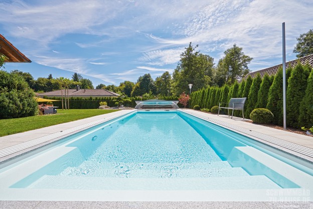 Auf eine positive Weiterempfehlung hin entschied sich die Familie schnell, die Experten von Sorg Schwimmbäder mit der Planung und Umsetzung ihres Traumpools zu beauftragen. Gemeinsam mit dem zuständigen Gartenbauer und dem Schwimmbadbauer Andreas Sorg nahm die Gestaltung des Projekts Form an, wobei alle Ideen und Vorstellungen des Bauherrn einflossen. „Die Wünsche der Bauherren waren, dass sie ihr Schwimmbad möglichst lange nutzen können. Daher wurde das Schwimmbad nicht nur mit einer Schiebehalle versehen, sondern auch noch mit einem Solar-Unterflurrollladen und einer Solaranlage“, skizziert Sorg die herausragenden Extras der Anlage. Diese Kombination habe er in den vielen Jahren seiner Praxis als Schwimmbadbauer noch niemals in dieser Form verbaut. „Das war auch für uns ein wahres Highlight“, beschreibt der Fachmann seine spannende Arbeit am Bodensee im Nachhinein. Die Arbeit hat sich gelohnt und so kann sich das Ergebnis wahrlich sehen lassen: Der über zehn Meter lange und beinahe vier Meter breite Pool erstreckt sich nun elegant an der breiten Seite des Gartens und wertet sein Erscheinungsbild optisch auf. Hierbei fallen die Schienen der Poolüberdachung kaum ins Auge, da sie besonders schmal sind und gleichzeitig eng parallel zum Beckenrand verlaufen. Eine seitliche Massageanlage, gepaart mit einem fein abgestimmten Zusammenspiel aus LED- und RGB-Farblichtern sowie einer modernen, vollautomatischen Pooltechnik, verwirklicht den Traum von Wellness zu Hause. Vor allem in den Abendstunden bestrahlen die Lampen das Wasser und tauchen den gesamten Garten in sinnliche Töne. Komfort und Entspannung stehen hier klar im Mittelpunkt: Aufgrund der beeindruckenden Länge des Pools kann das Ehepaar seinem täglichen Work-out im Freiem ungestört nachgehen. Im Anschluss verwöhnen die kräftigen Jets der Massageanlage die beanspruchten Muskeln, bevor es zum Ausruhen mit einem spannenden Buch auf die geschützte Sonnenterrasse hinter dem Haus geht.