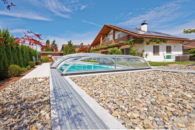 Milde Temperaturen, fruchtiger Wein, idyllische Inseln und vor allem eine atemberaubende Landschaft mit seichten Hügeln machen die Bodenseeregion im nördlichen Alpenvorland zu einem besonders beliebten Urlaubsziel. Wäre es nicht traumhaft, jeden Tag in solch einer Urlaubsatmosphäre aufzuwachen und den Bodensee direkt vor der Haustür zu haben? Für das Ehepaar mit Kindern, deren traditionelles Haus sich nur wenige Kilometer von Friedrichshafen entfernt befindet, ist dies Wirklichkeit. Ein eigener Außenpool im Garten sorgt hierbei für das extra Quäntchen Lebensqualität – und das nicht nur im Sommer. Der großzügige Pool verwandelt sich nämlich durch die ausgeklügelte Kombination aus Schiebehalle und Solar-Unterflurrollladen auch bei kälteren Temperaturen zum Zentrum der Freizeitaktivitäten für die ganze Familie. Darüber hinaus war es den Bauherrn wichtig, dass der Pool eine stattliche Länge hat, sodass auch das sportliche Schwimm-Work-out nicht zu kurz kommen würde.