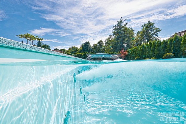 Neben Entspannung und Wohlfühlatmosphäre werden auch Nachhaltigkeit und Energieeffizienz bei der mehrköpfigen Familie am Bodensee groß geschrieben. Eine Photovoltaik- und Solaranlage auf dem Dach des Hauses in Kombination mit der Unterflurrollladenabdeckung halten die Betriebs- und Instandhaltungskosten des Pools auf einem möglichen Minimum. Und auch die Hinterfüllung des Beckens, deren Dämmwerte besonders zuverlässig sind, wirkt sich begünstigend auf den Geldbeutel und damit die Umwelt aus.