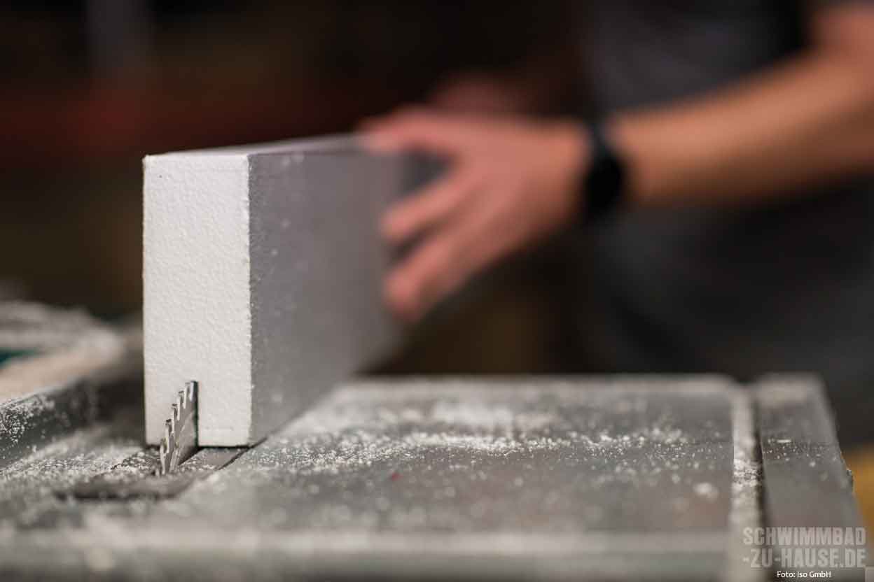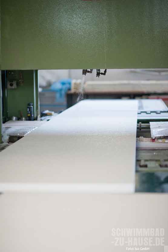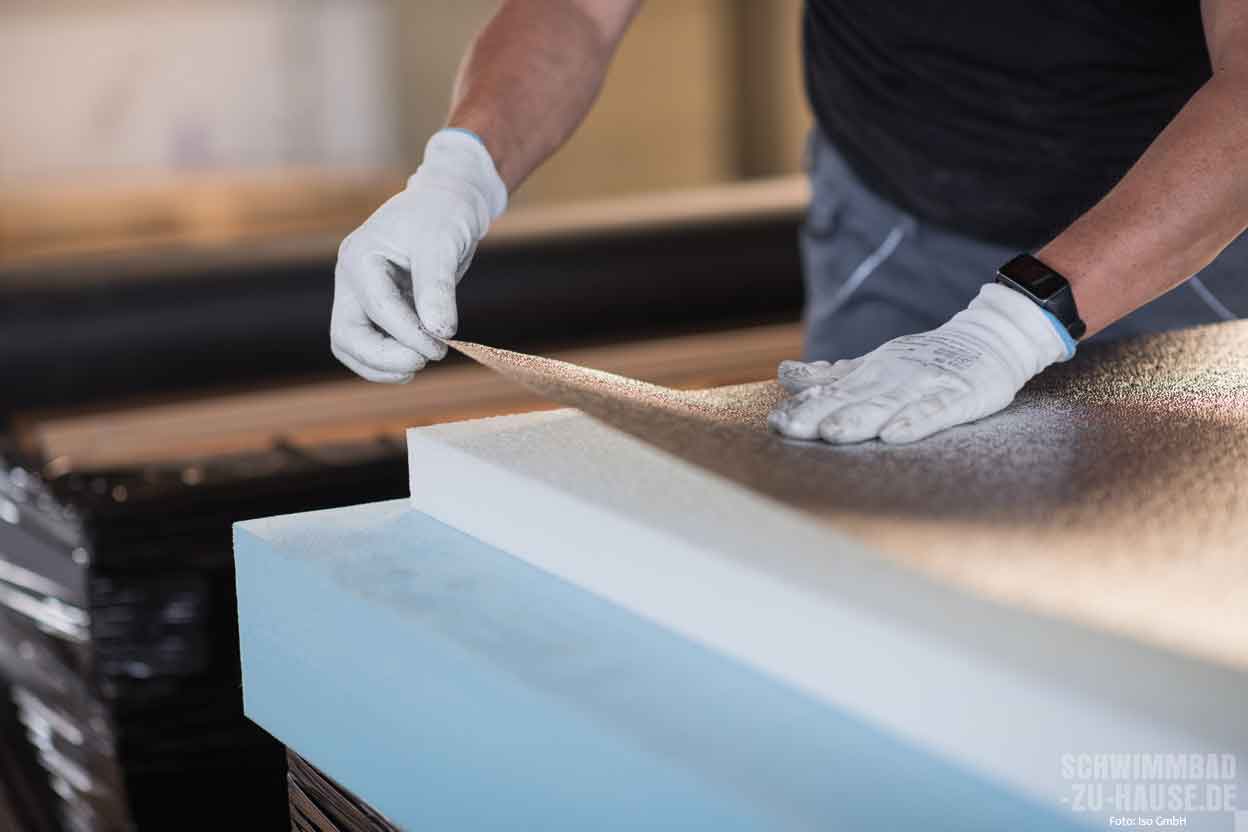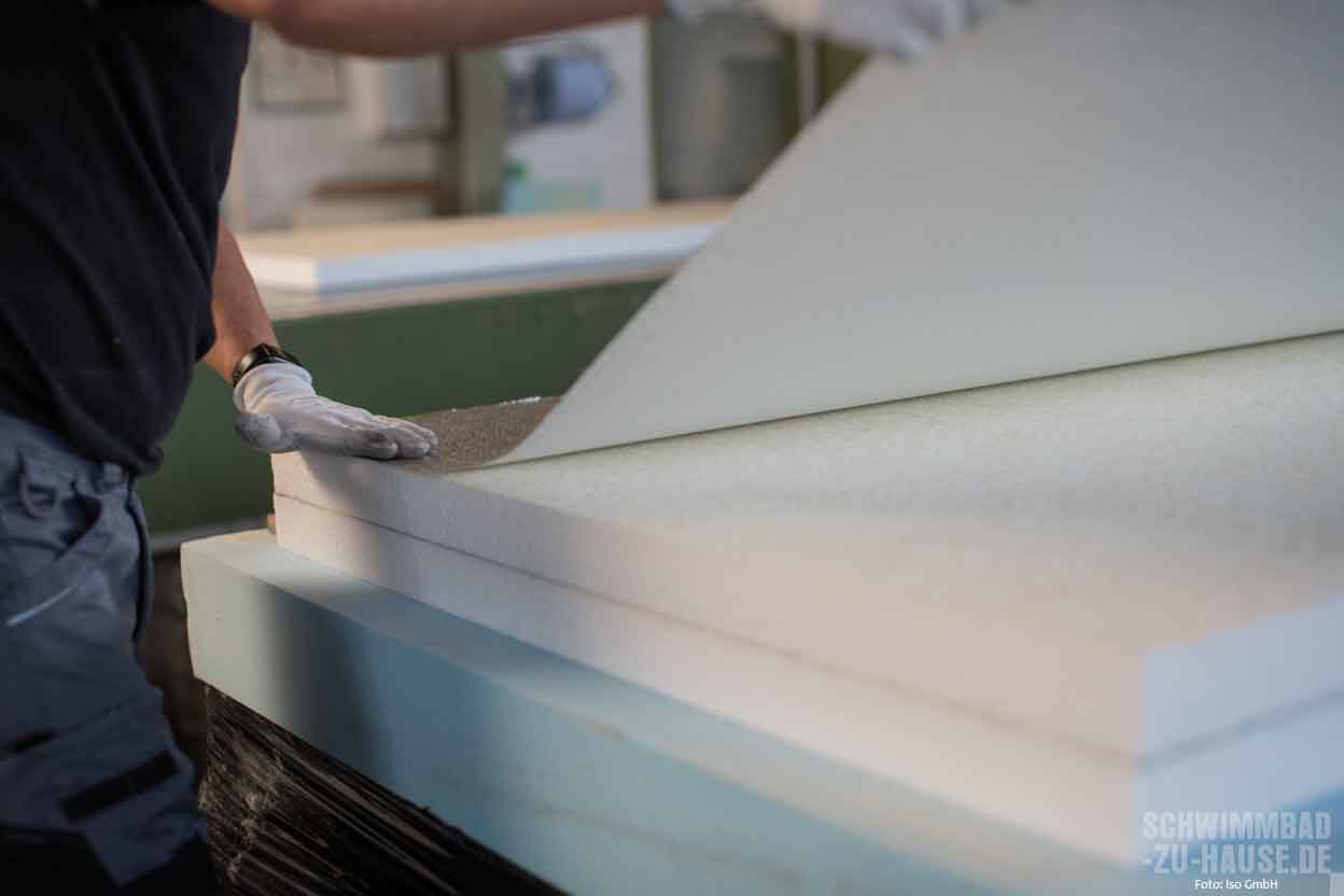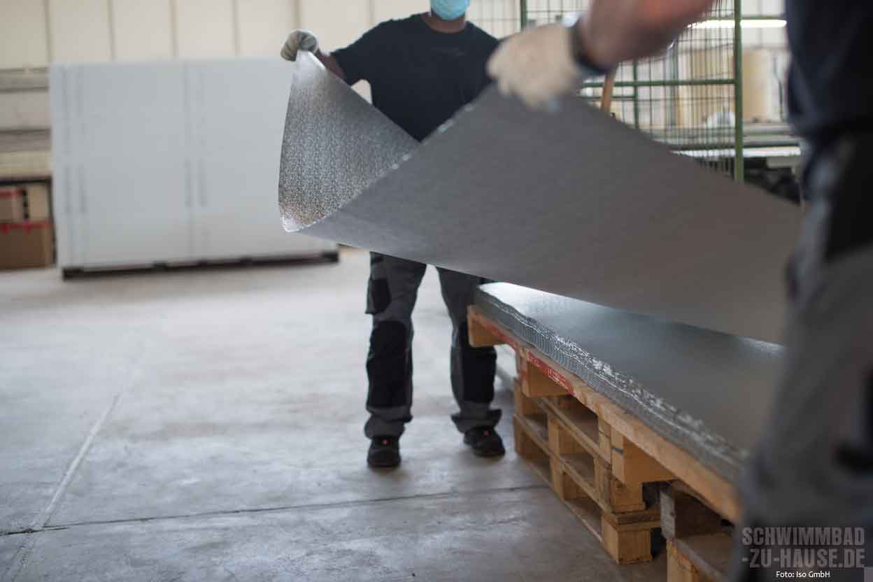 Beim direkten Produktionsprozess werden die einzelnen Styropor-Blöcke mit einem heißen Draht in unterschiedliche Dämmschichtstärken (10, 20, 30, 50, 80 und 100 Millimeter) auf Element-Größen (2,50 x 1 Meter) geschnitten. Je nach ISO-Typ trägt das geschulte Personal im nächsten Schritt den jeweiligen Kleber maschinell auf die Platte auf. Dann werden die Elemente einzeln mit der vorbereiteten Alufolie kaschiert. Die Beschichtungen werden gemäß ISO-Rezeptur gefertigt. Damit sie in einwandfreiem Zustand auf die Baustelle kommen, werden die fertigen Eimer in einem speziell klimatisierten Bereich aufbewahrt. Alle Kleber und Beschichtungen sind nach ISO-Vorgaben gefertigt und speziell für die Verwendung im Schwimmbad entwickelt und geprüft.